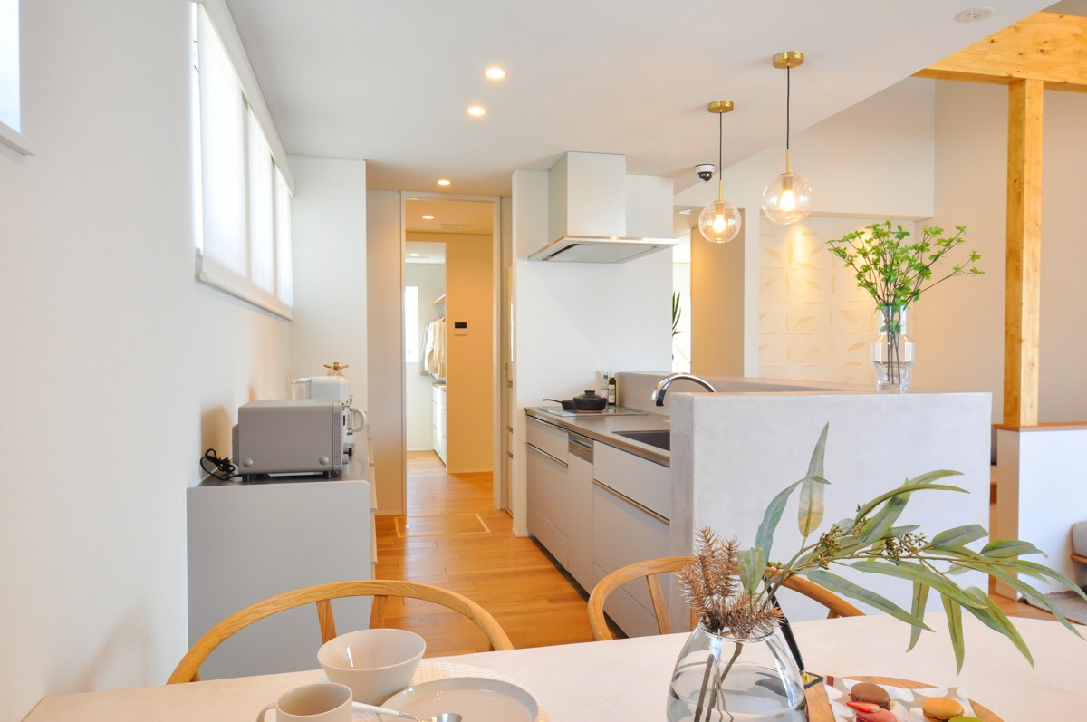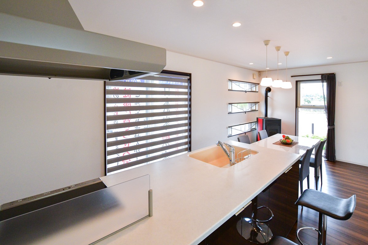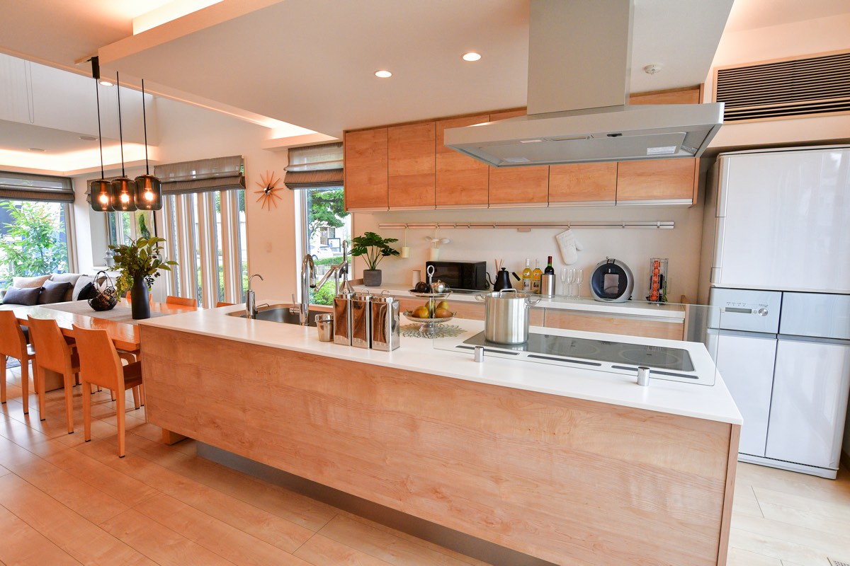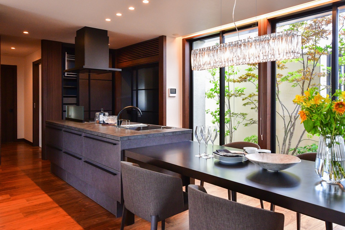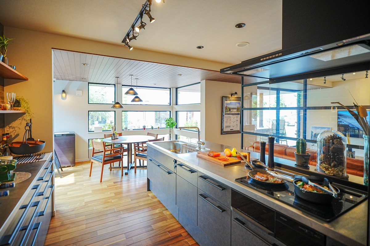 キッチンからリビング、ダイニング、和室を見渡すことができる開放感あるアイランドキッチン。大開口に面したダイニングキッチンは明るく気持ちの良い空間となっており、家族みんなで料理や食事を楽しむことができる。