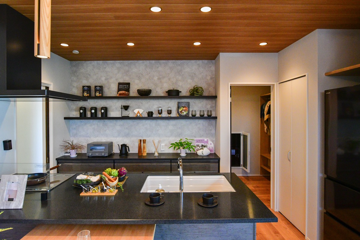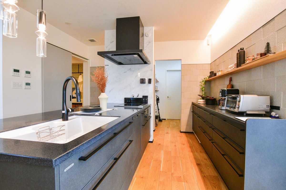 オシャレなアイランドキッチンでありながら収納もしっかり確保。裏一面の大収納は見た目もスッキリ。機能とデザインを両立。ママのキッチンライフもテンションが上がる!