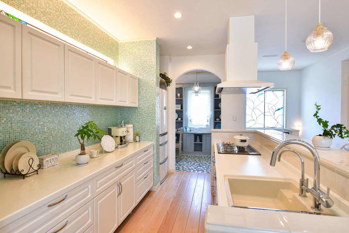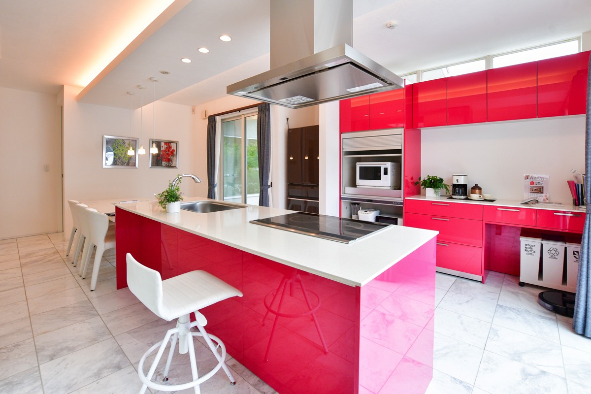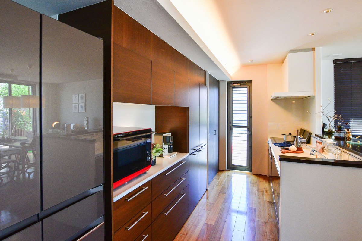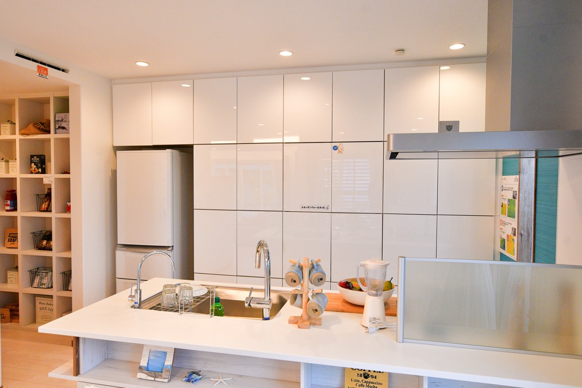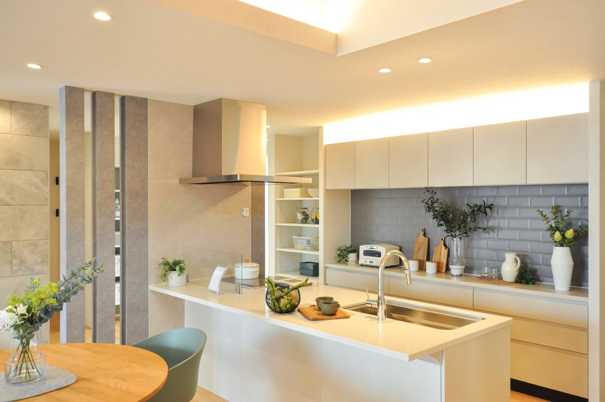 リビングのソファに座った家族と同じ方向を向きながら料理ができるキッチンは、広々と動きやすいレイアウト。間仕切りとなるガラスボードは空間に新鮮さを与えてくれ、常にスッキリとしたキッチンを実現してくれる多種多様な収納は強い味方。