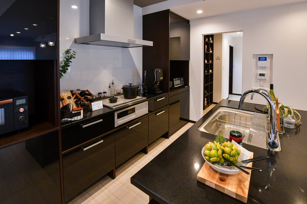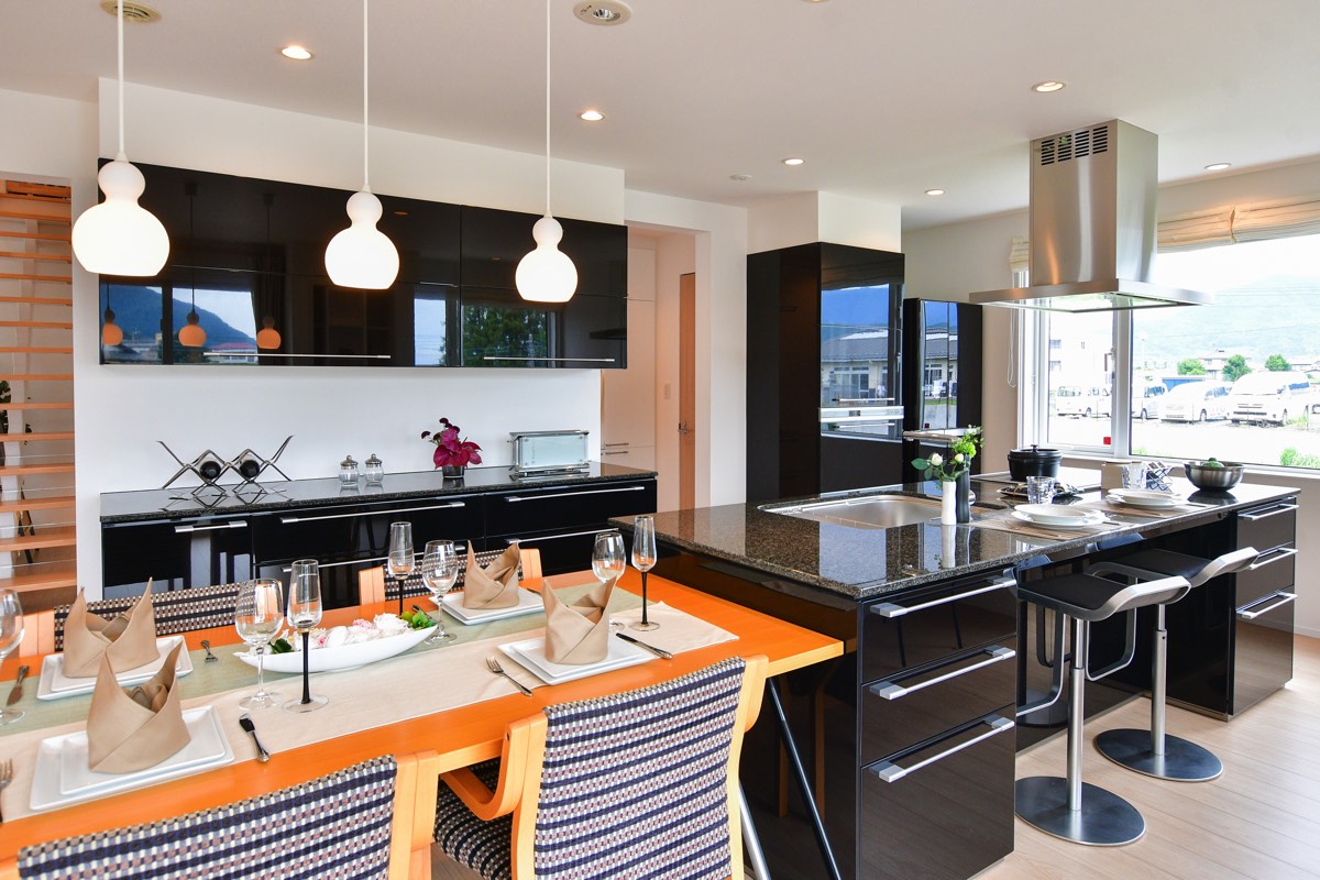 キッチンとダイニングを横並びにすることで食事の配膳や片付けの動線がコンパクトに、家事の負担を軽減できる。ブラックコーディネートでまとめたキッチン~ダイニングはLDKの中でも主役ともいえる存在感。