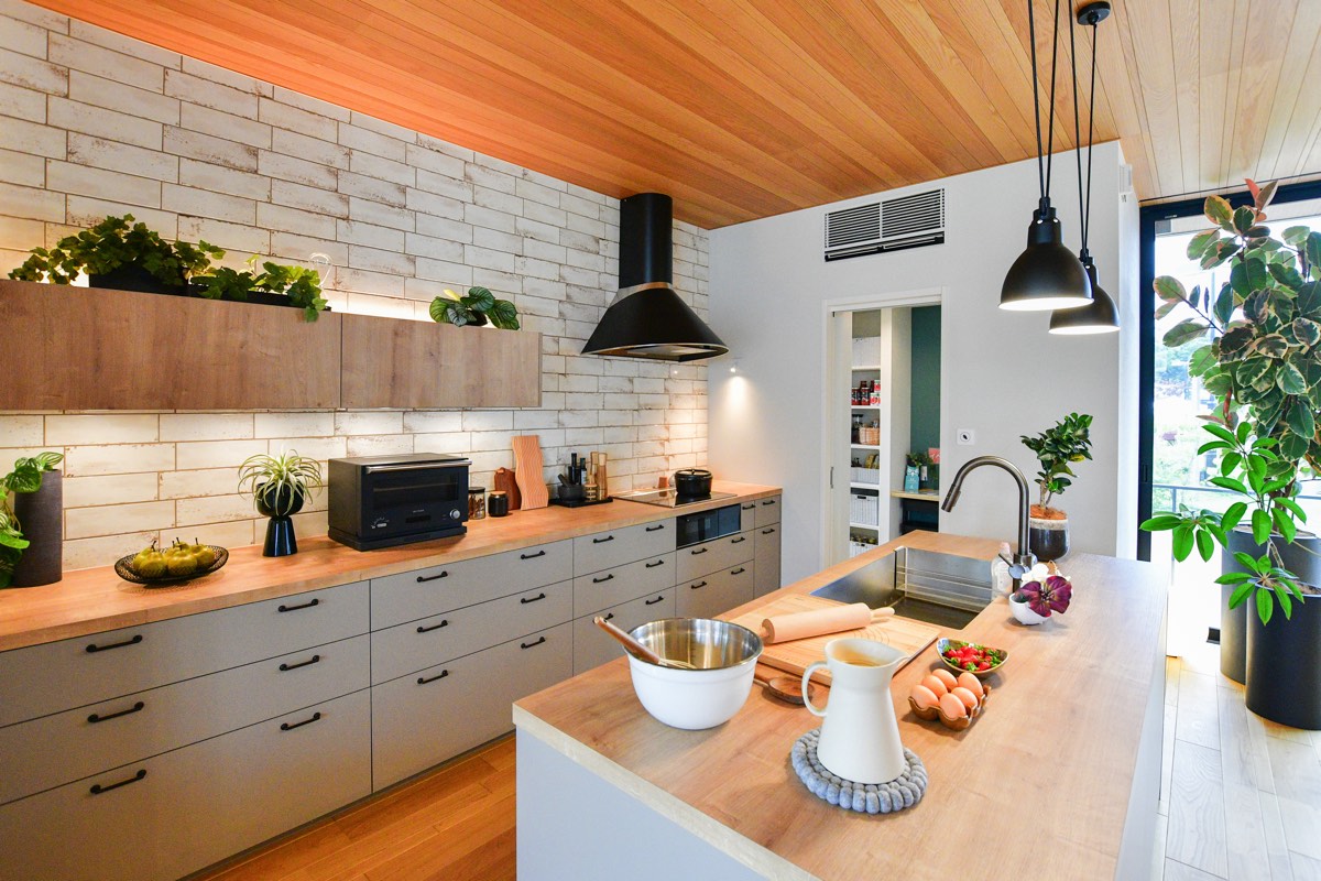 カウンター部分も広くキッチンでの作業が捗る。カップボードもカウンターを広くし、キッチン家電を並べて配置。キッチン奥にはパントリーも設置しているのでキッチンからの動線もよく、家事を助けてくれる。