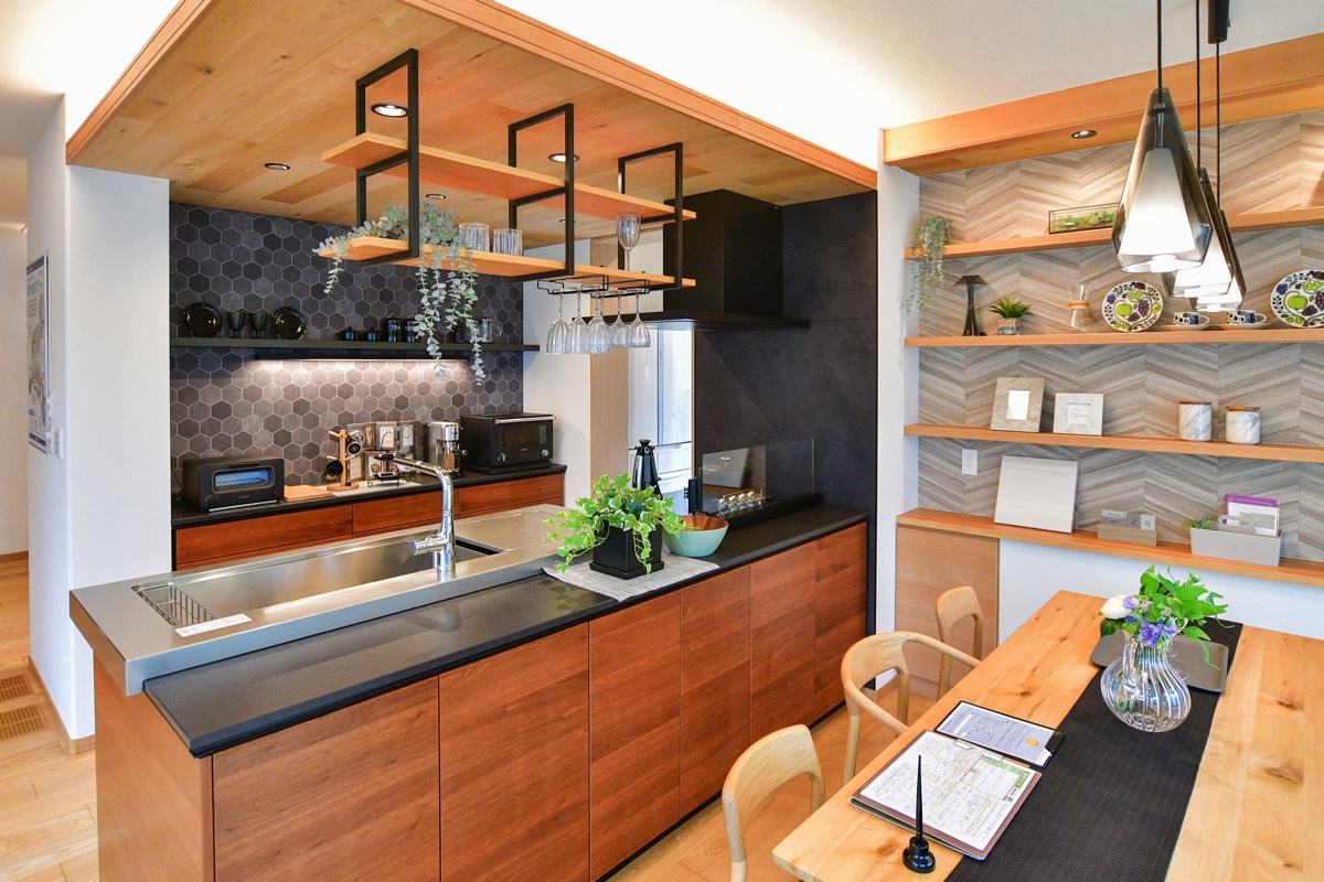 アイアンの吊り棚や間接照明、アクセントクロスでカフェのような雰囲気のキッチン。機能性・収納力・お手入れのし易さもバッチリ!おしゃれさの最先端を突き進むキッチンをぜひ。