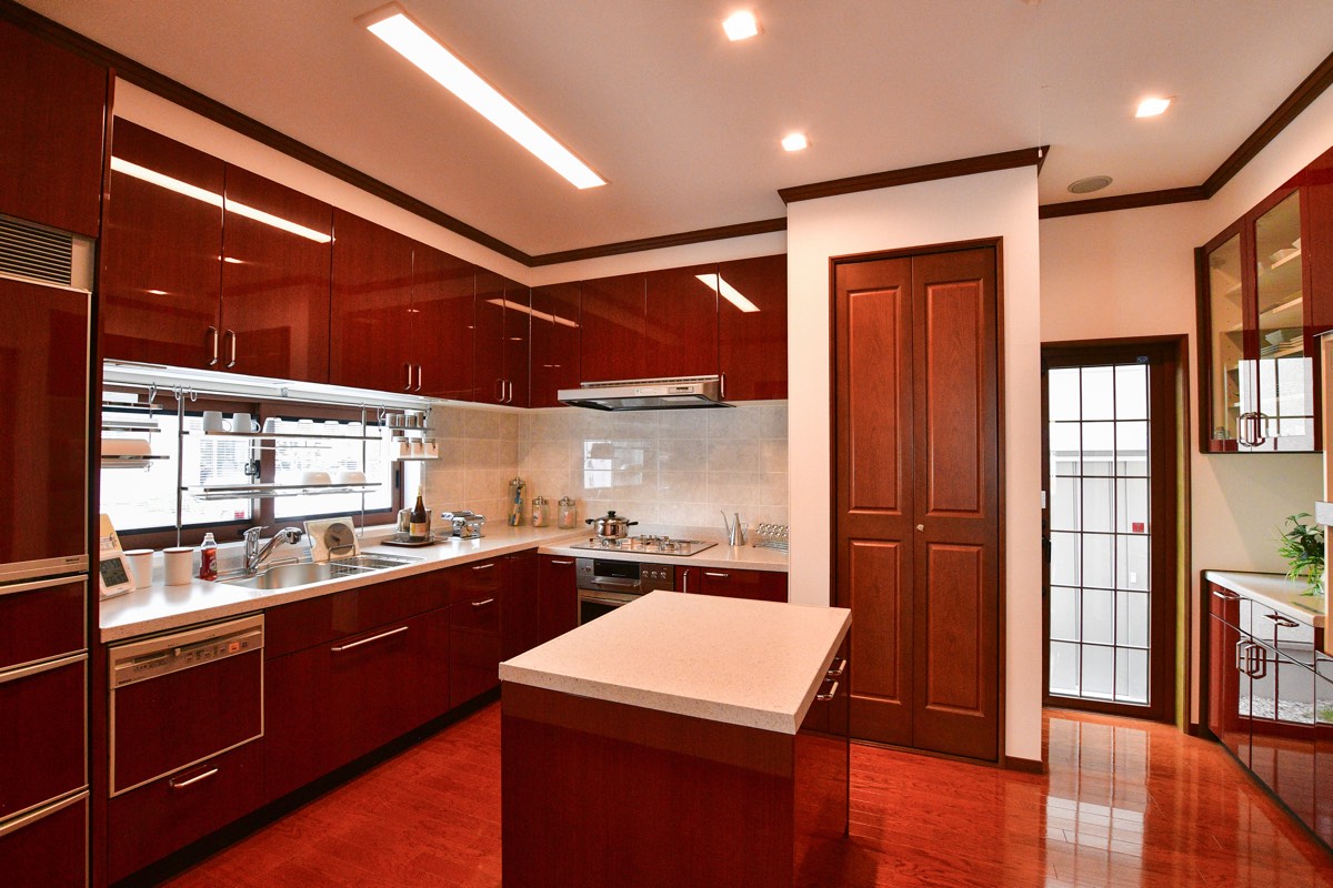 回遊性の高さが人気のアイランドキッチン。その天板はセラミックで出来ており、「和」の中に上質な雰囲気を演出。また、奥に聳えるカップボードは壁付収納でスタイリッシュに。