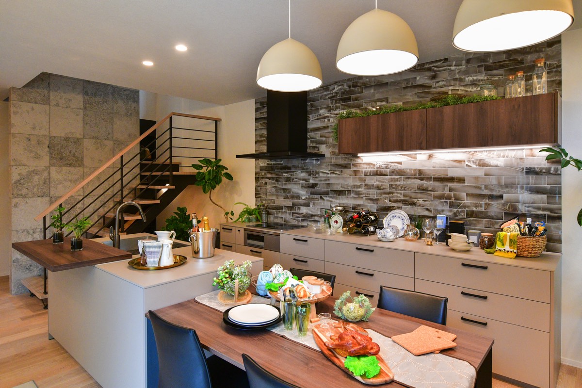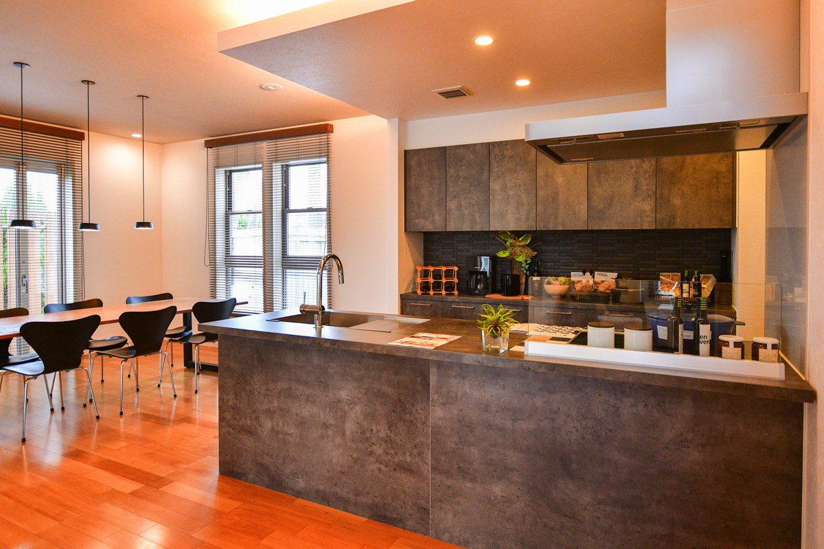 アイランドスタイリッシュなのキッチンはダイニングと並列に並べ料理の支度も快適に!収納スペースも十分に確保され毎日の家事もラクラク。「家事楽住まい」を表現したママに優しいキッチン。