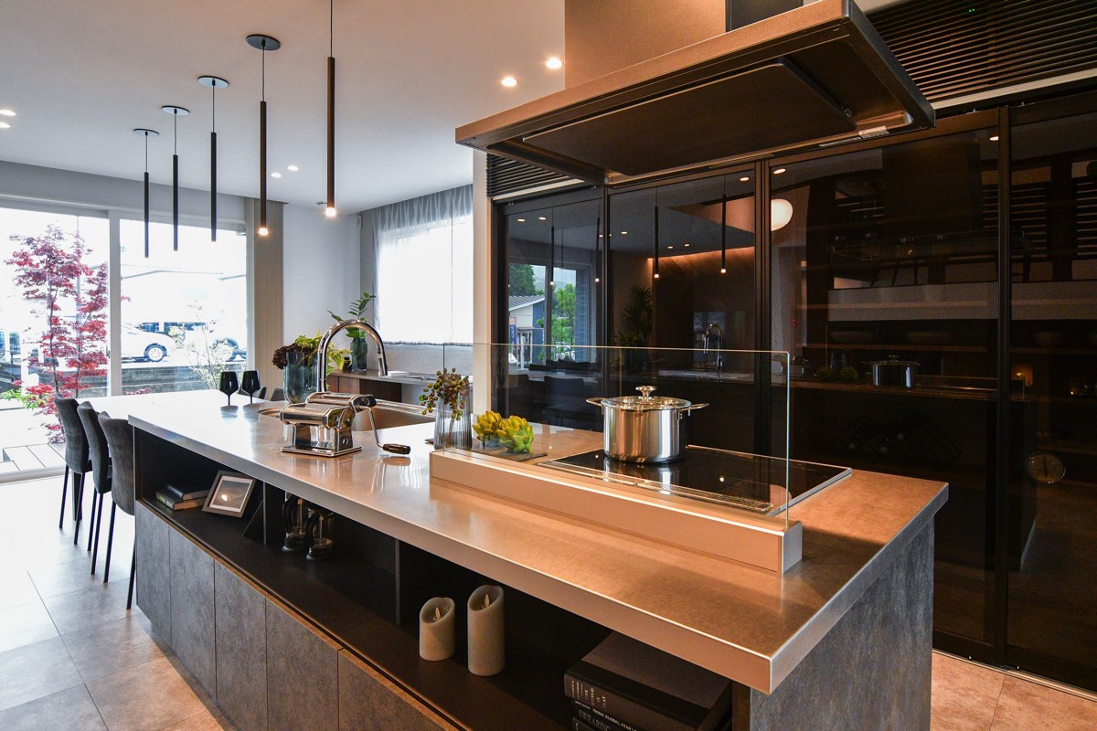 グラフテクト製のオープンキッチンを採用。キッチンをただの厨房ではなくインテリアとして考え、デザイン性を追求することで上質な住宅を演出している。