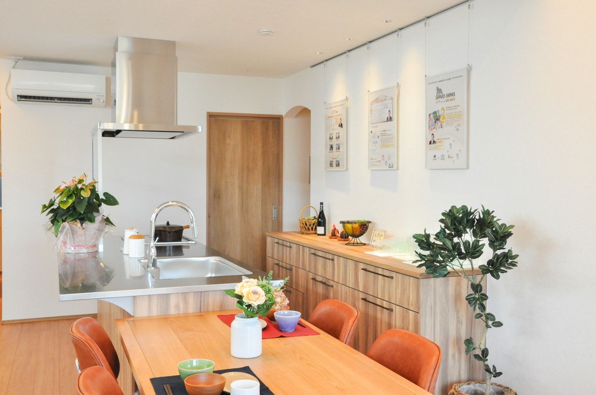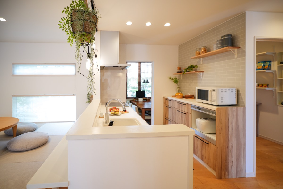 案外長い時間を過ごすことになるキッチンやダイニング。収納力抜群のキッチンや小上がりの使いやすさはもちろん、居心地の良さも大切。対面式のキッチンで家族の様子を見ながら快適に利用できる。