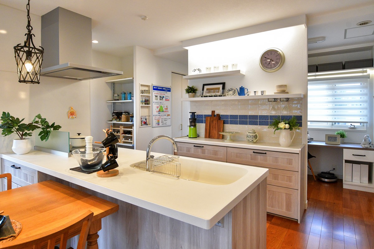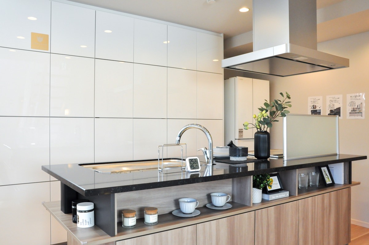 アイランドキッチンは料理の配膳や補助がスムーズにでき、誰が料理をしていても家族の助けを得やすいため料理の時間が楽しくなる。また前面の収納は散らかりやすいキッチン周りをスッキリ保つのに効果的。