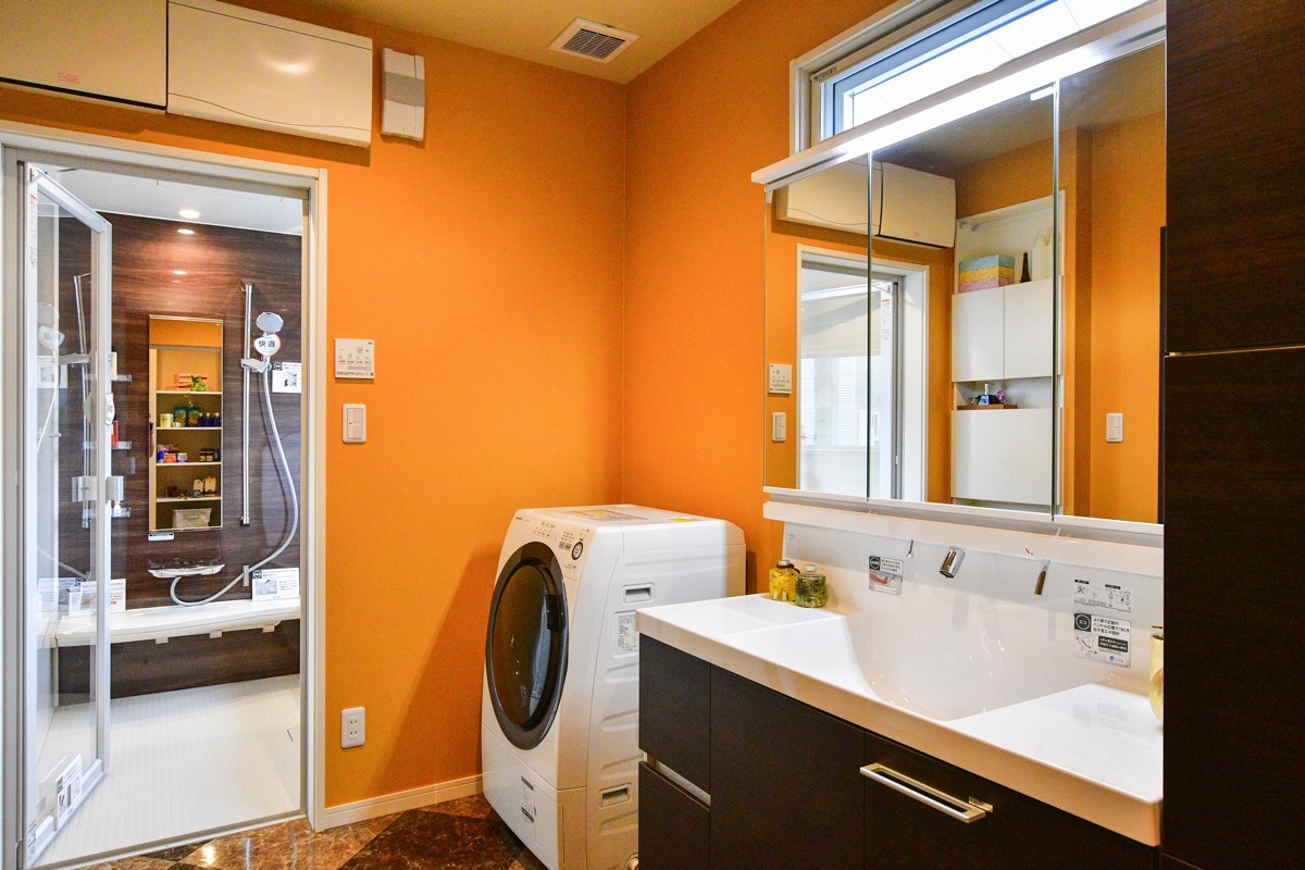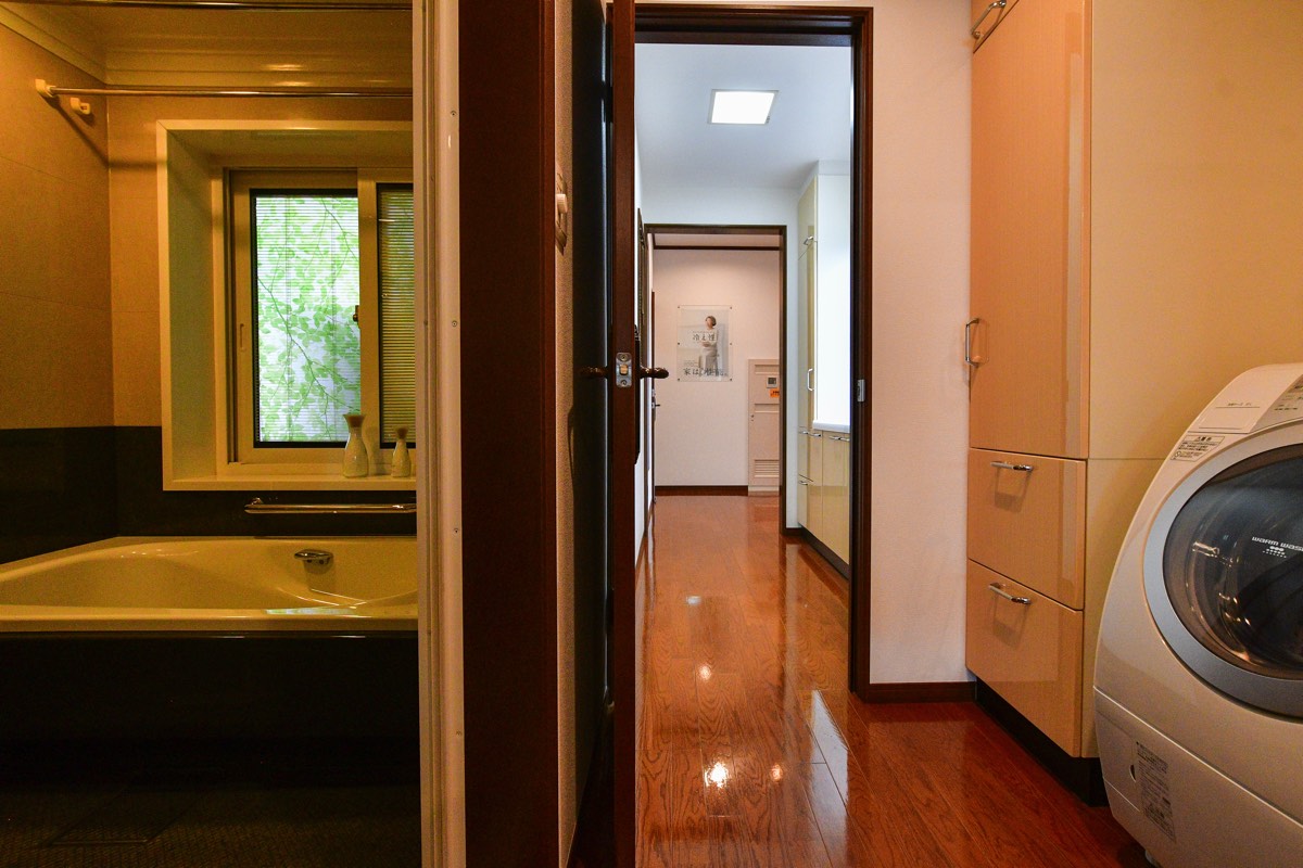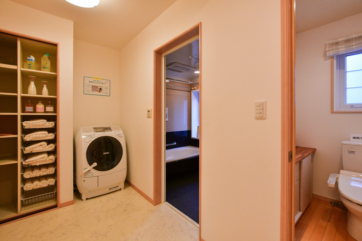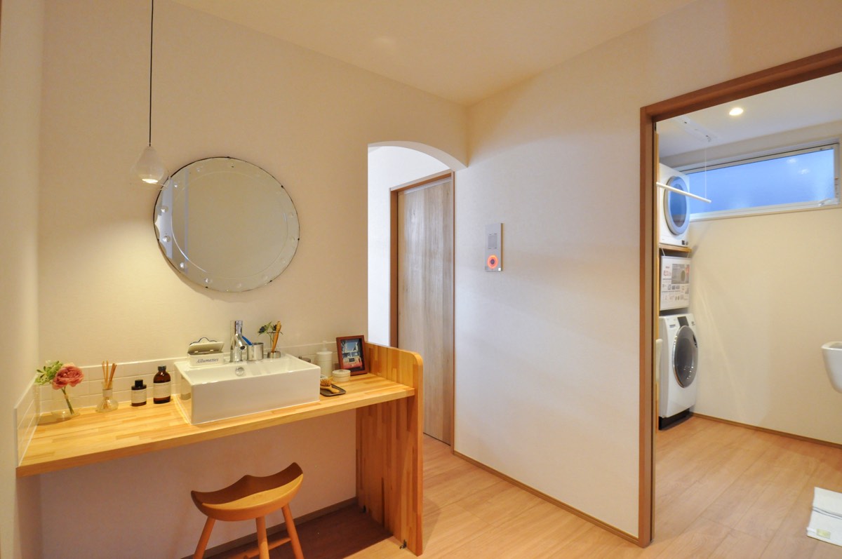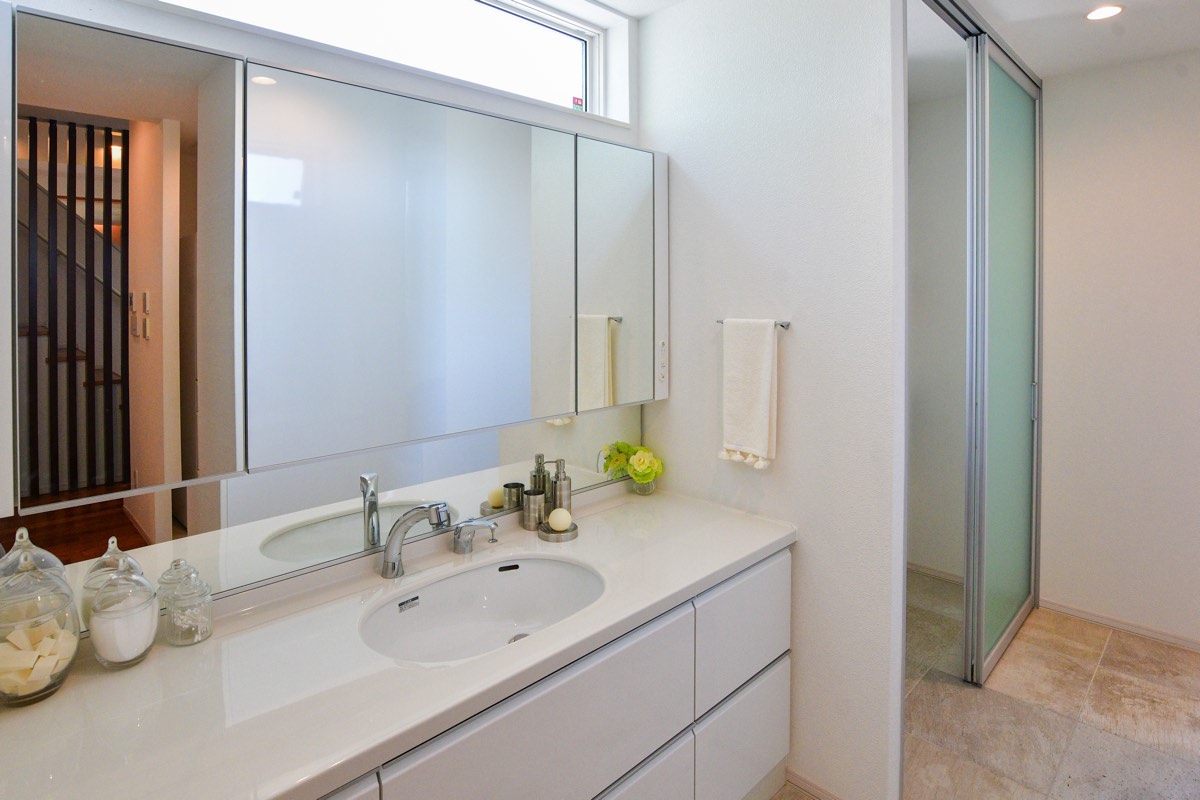 3畳にまとめられた洗面所はキッチン側・玄関側両方から出入りができ、空間を最大限活用できるよう収納は大型ビルドインでスッキリ。「まほうびん住宅」のグローバルハウスなら冬の洗面所も寒くない。