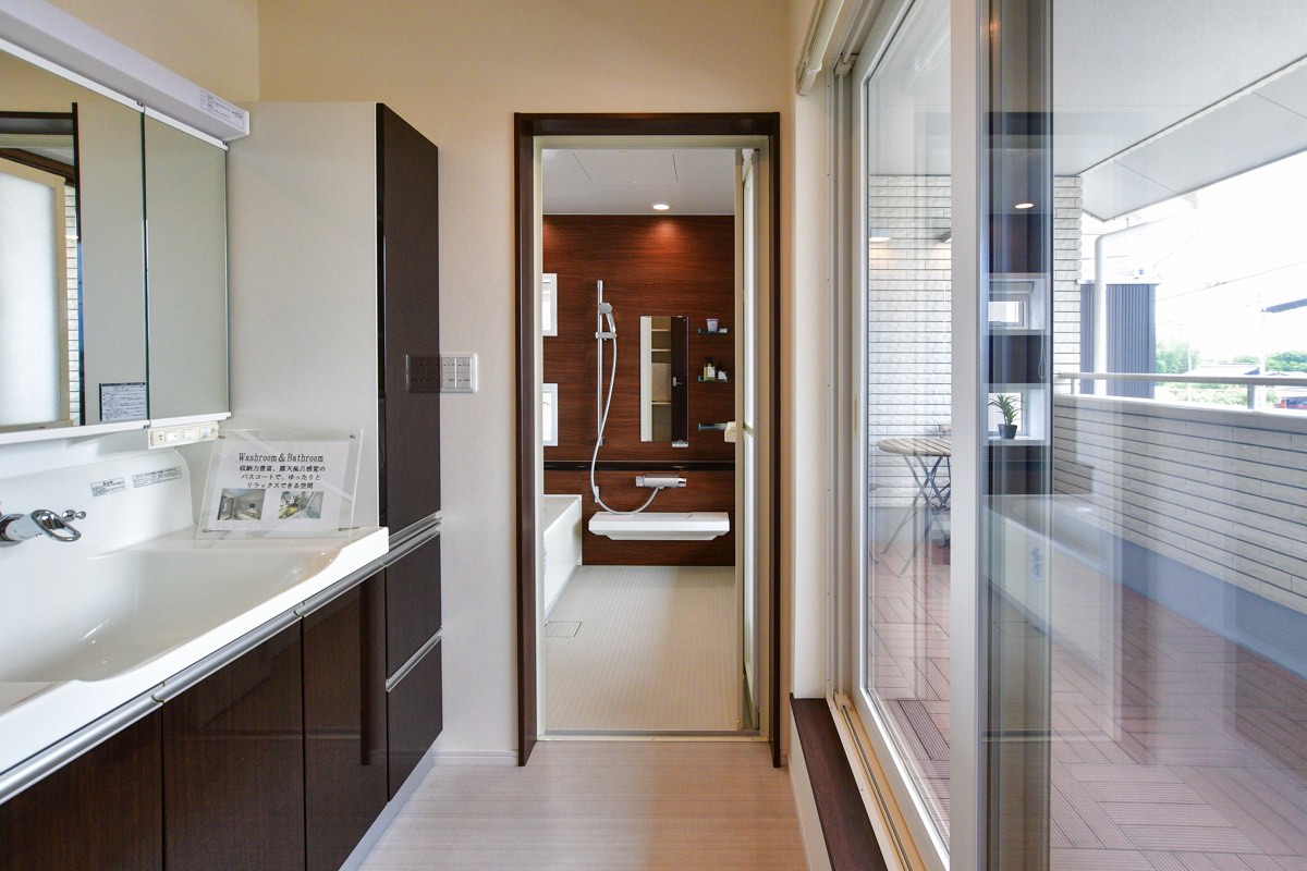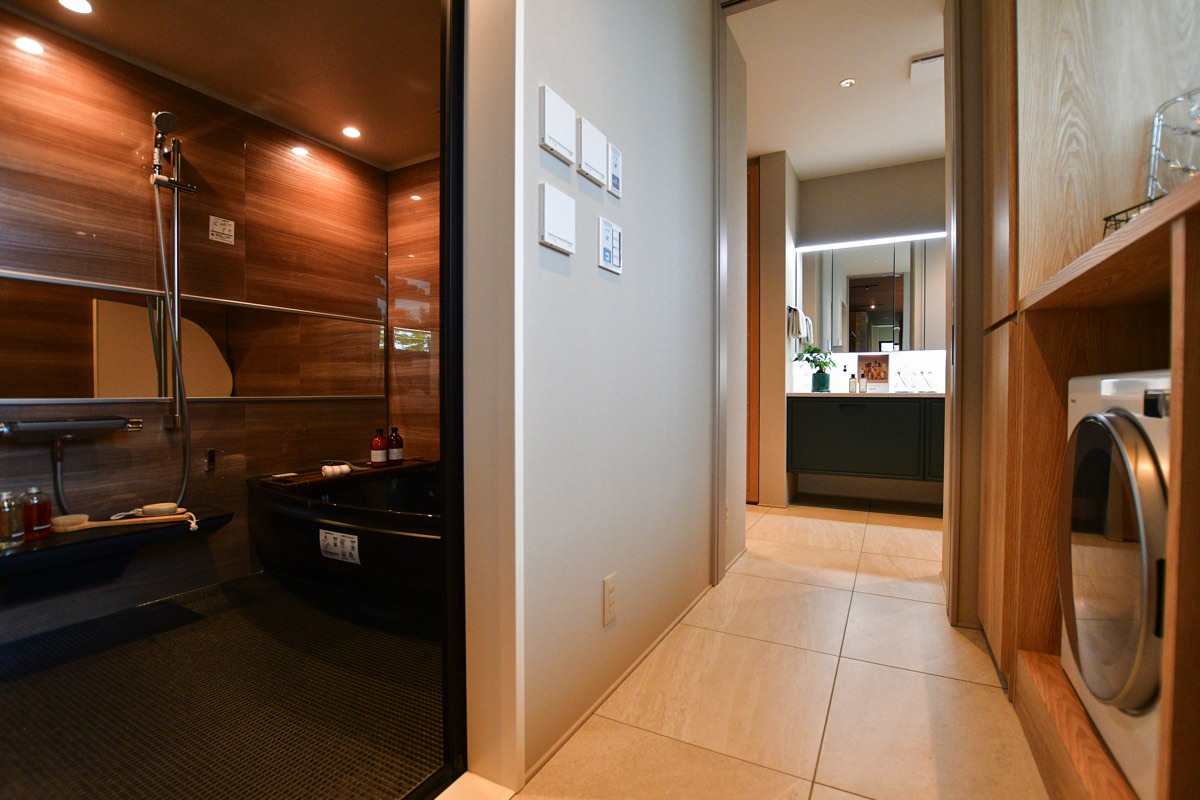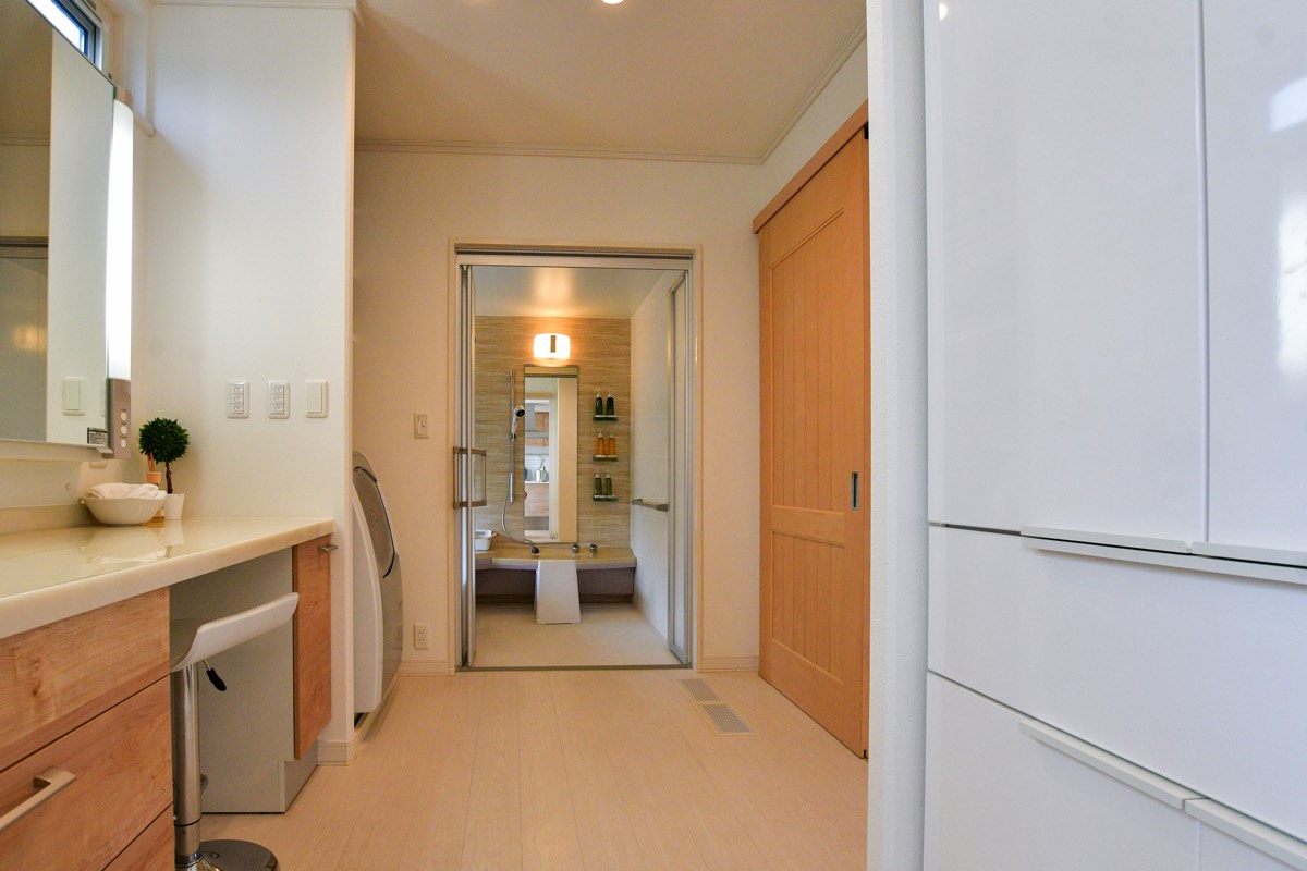 直線上に配置した一体感のある水回り。統一されたインテリアデザインと使い勝手の良い家事動線を実現。
