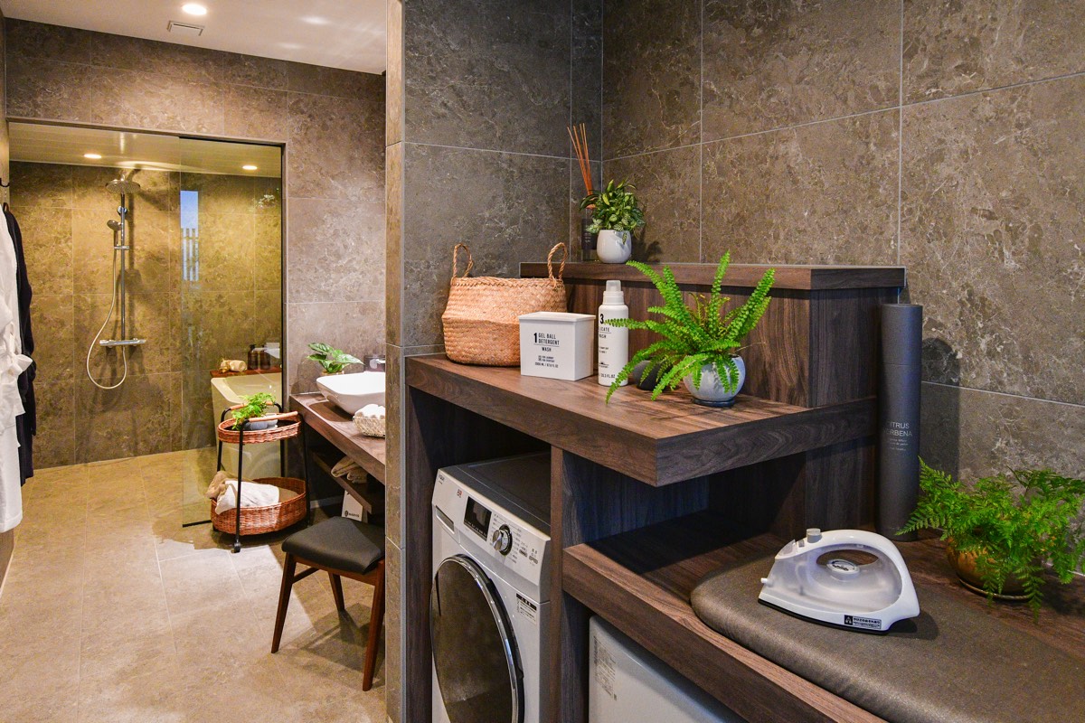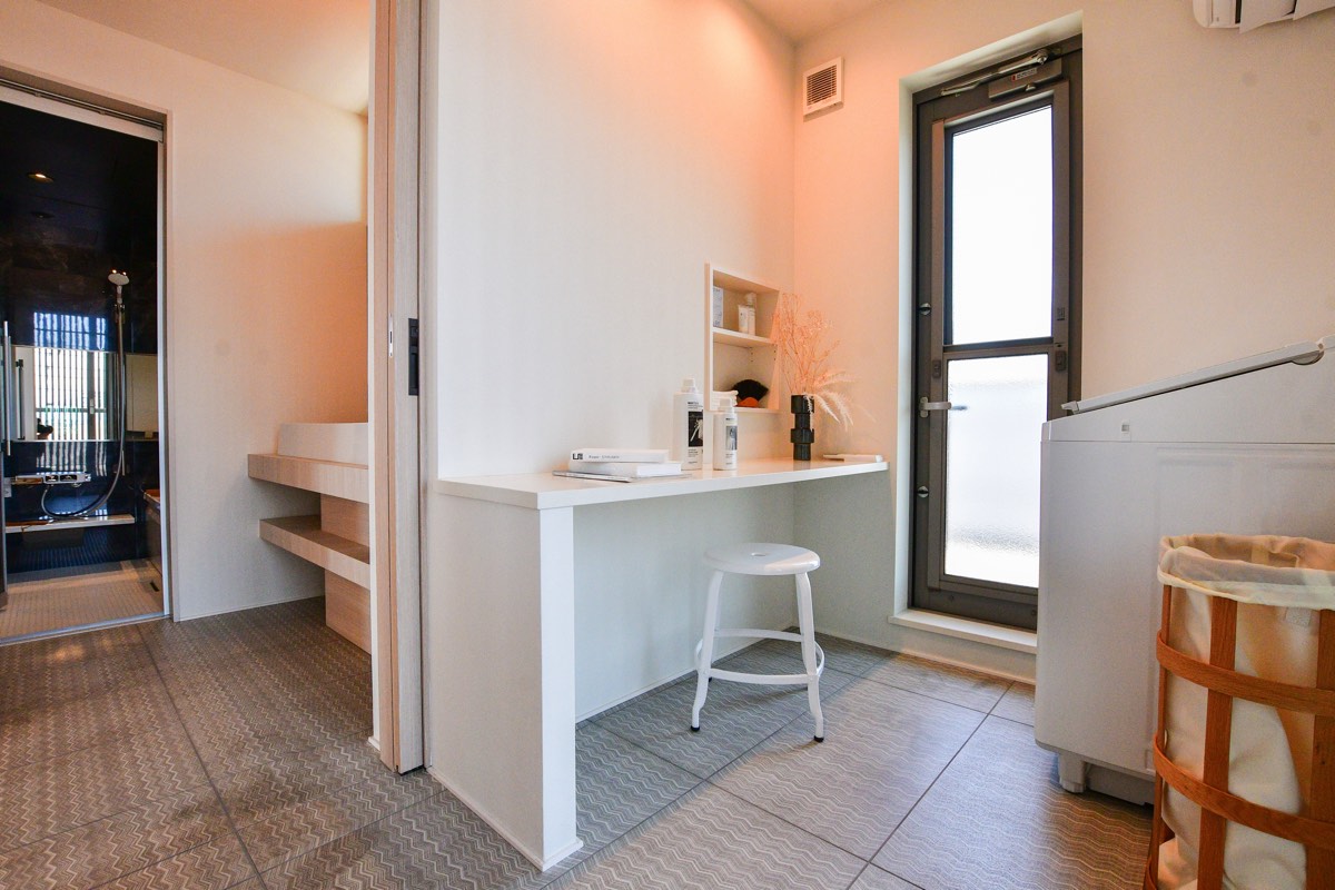 水廻りが集約されているから効率的で快適な動線。あると便利!が沢山詰まったランドリースペースには家事室もあるため、洗濯物を「洗う」「干す」「たたむ」の全てを一室で完結。家事時短を叶えてくれる。
