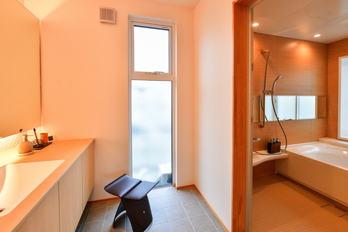 天井近くの窓から差し込む光で明るい空間設計。洗面カウンターにはタイル貼りにする事でおしゃれに見せる工夫を。また、椅子が入るスペースを作るなど準備もスムーズに行える機能性の両方を兼ね備えている。