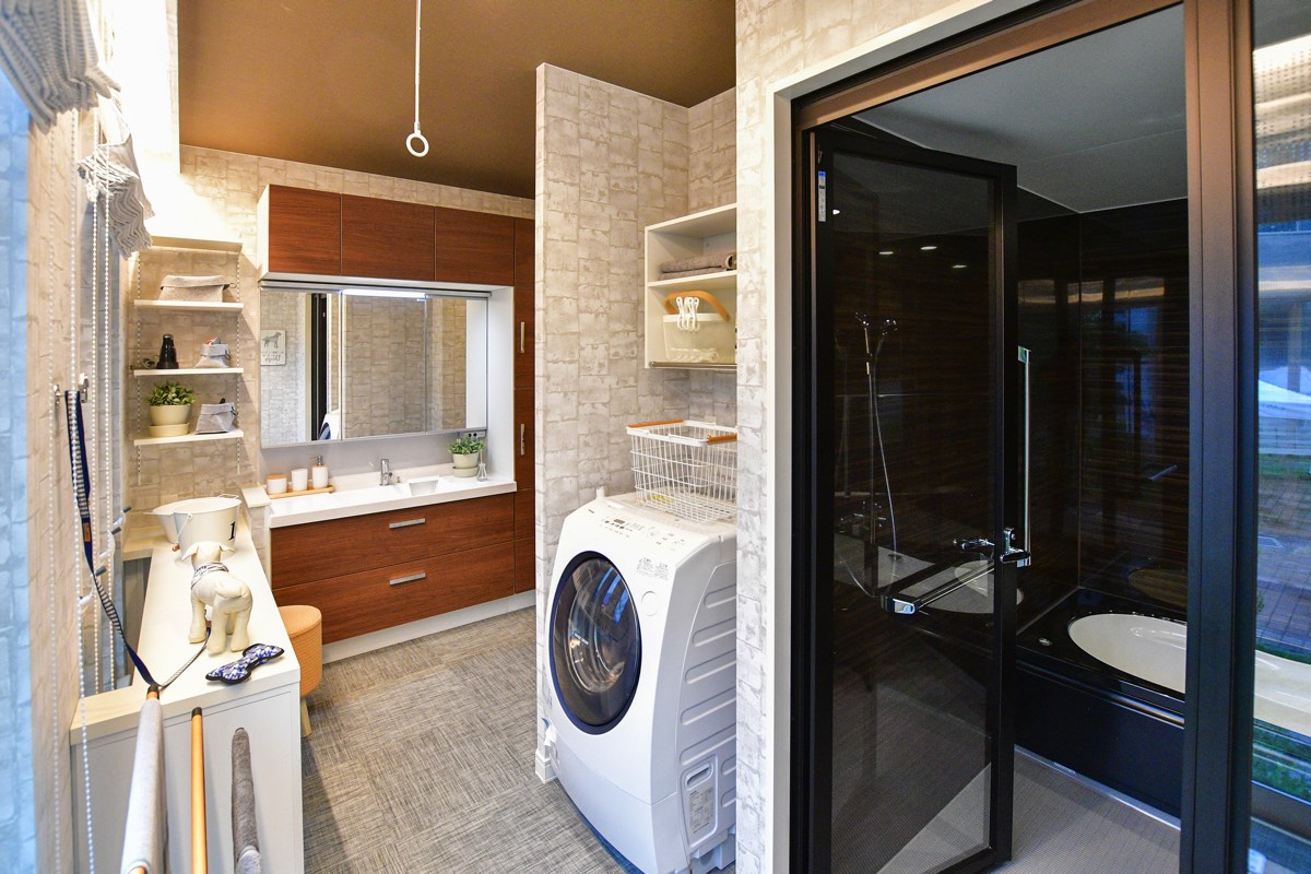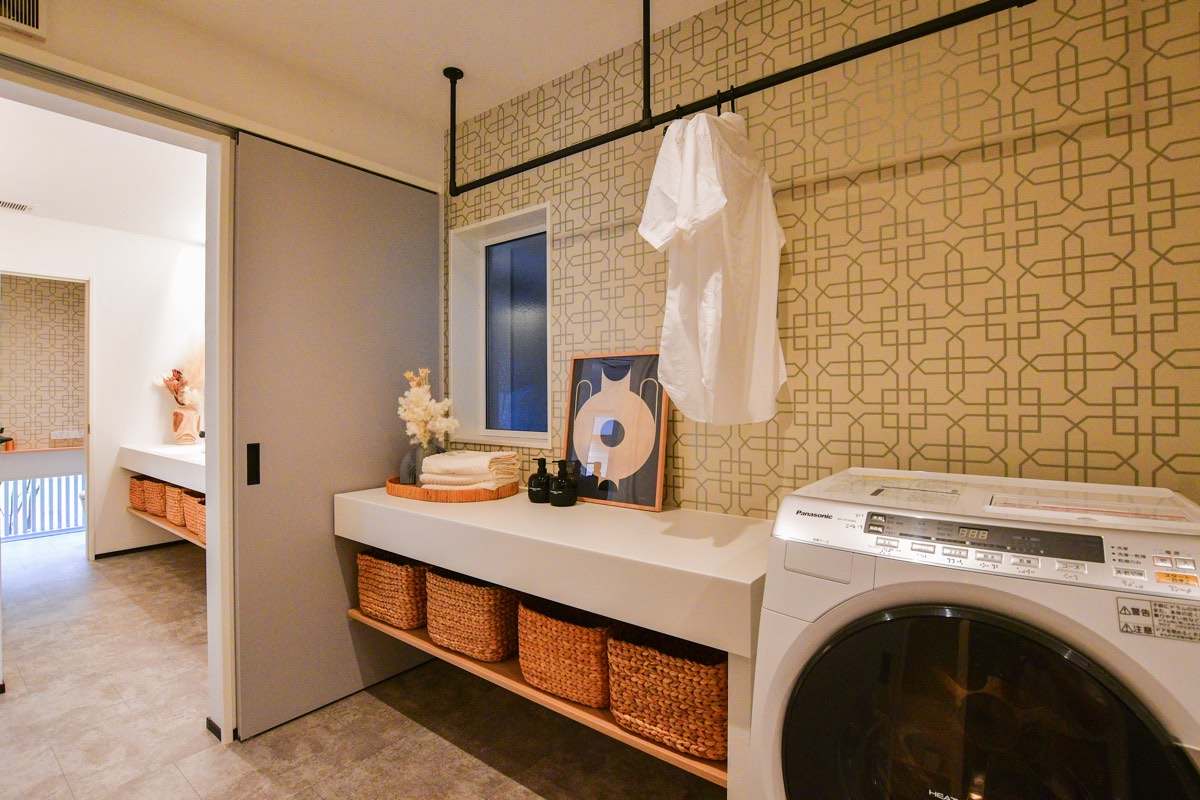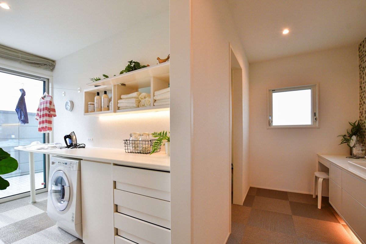 洗面脱衣室には室内物干しやカウンターを採用しており、洗濯物を洗ってから乾かす、そして畳むが1か所で完結できる。家事の負担や時間の短縮ができ、その分家族団らんの時間が増やせる魅力的なサニタリー。