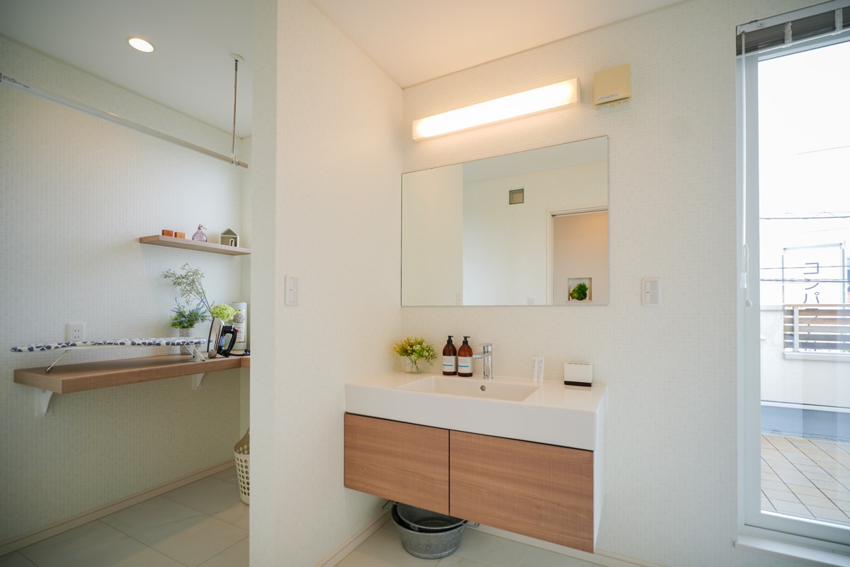ホテルのようなデザインにこだわった洗面台と動線を意識しコンパクトにまとめたサニタリーはグローバルハウスが特許を取得したスマート家事室。洗濯などの家事負担を軽減。