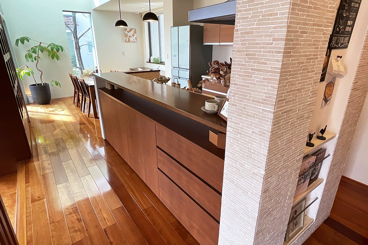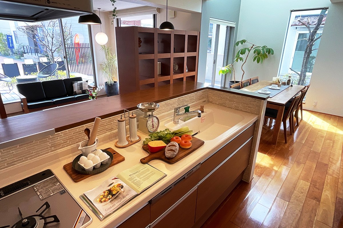 食事、洗濯、掃除など、日々の忙しい家事を楽にするアイデアがいっぱい!キッチンから一直線に並ぶ家事動線や、育ち盛りの子どもに目が行き届く空間構成など、考え抜かれた工夫の数々は必見。
