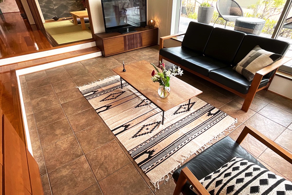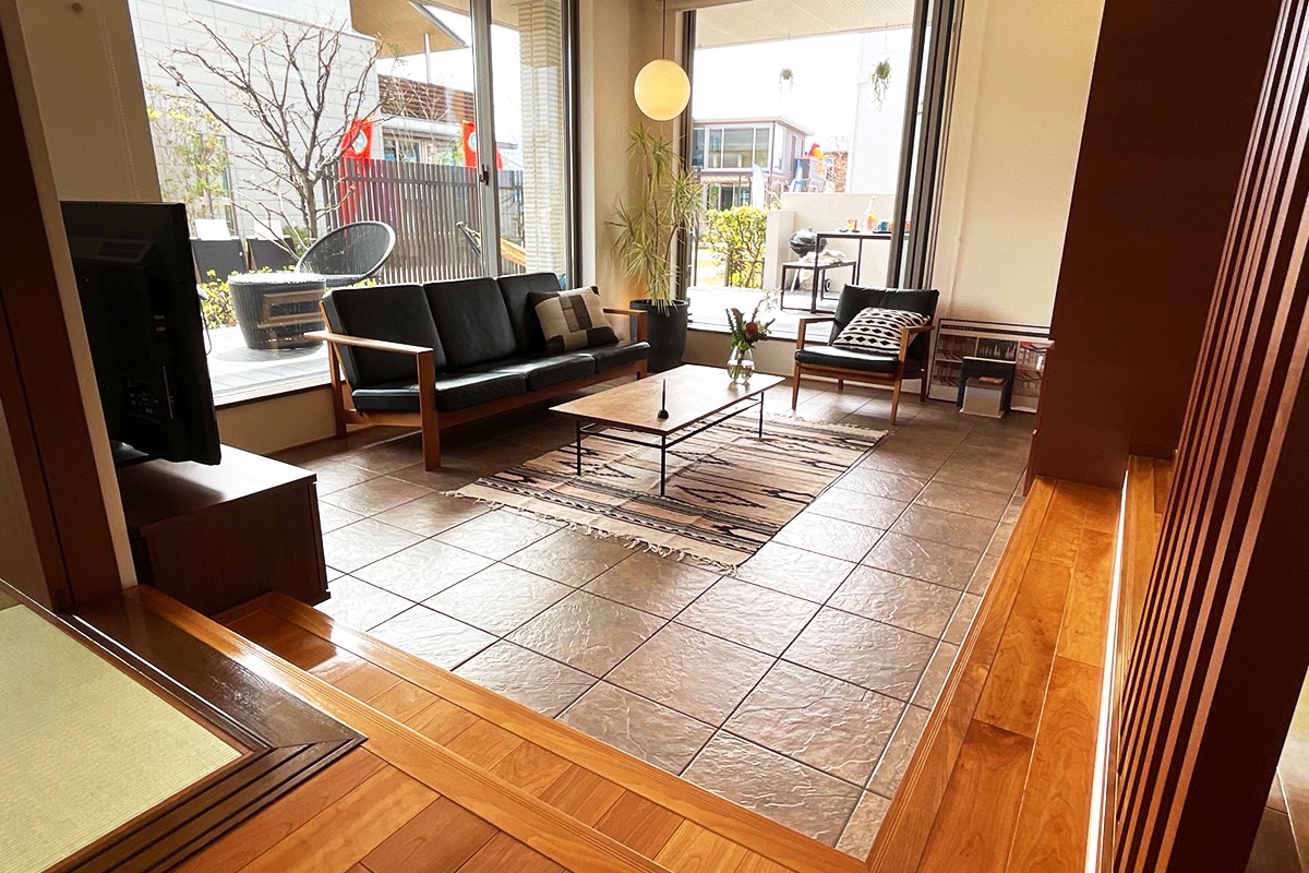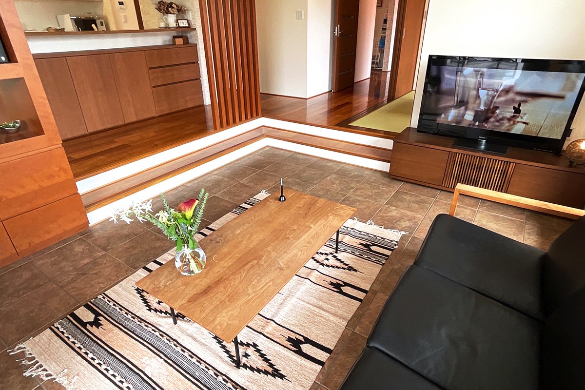 リビングはこのモデルハウスの一番の自慢。こもり感が心地良く、家族が自然と集まってくる空間に。広々と見せる、おしゃれで快適なスペースを実現。