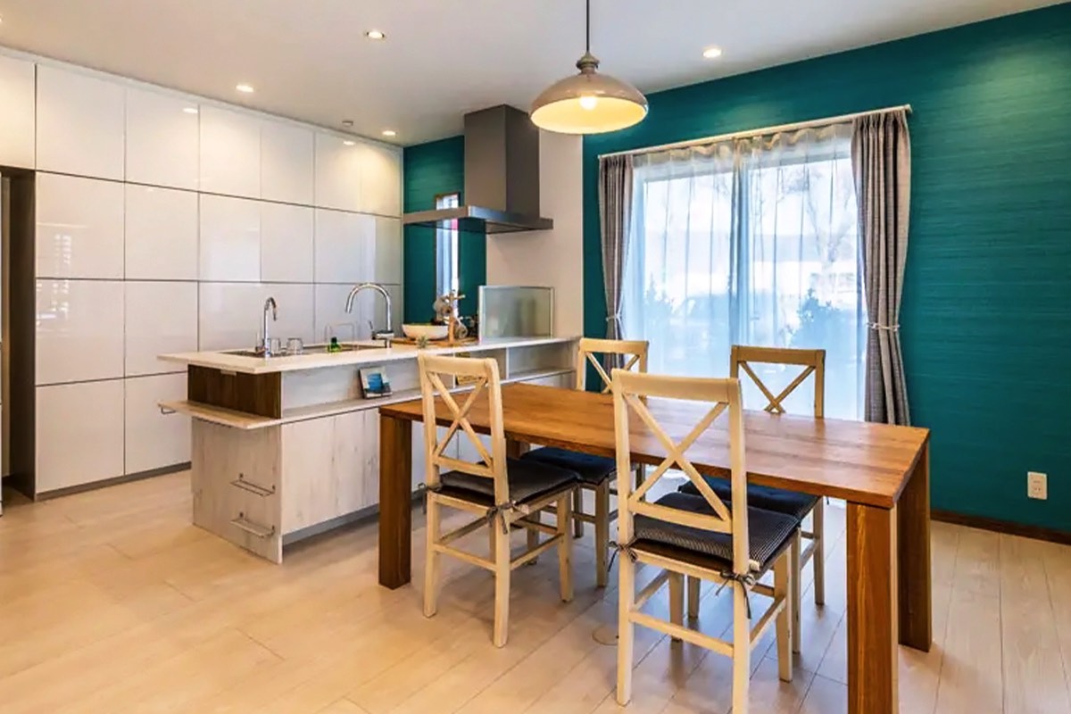 LDKを繋ぐ家の中心「コミュニケーションブリッジ」が、家族のコミュニケーションの橋渡しの場所に。キッチンには壁一面にヒノキヤオリジナルの「キッチンウォールキャビ」を備え、大容量の収納を実現。