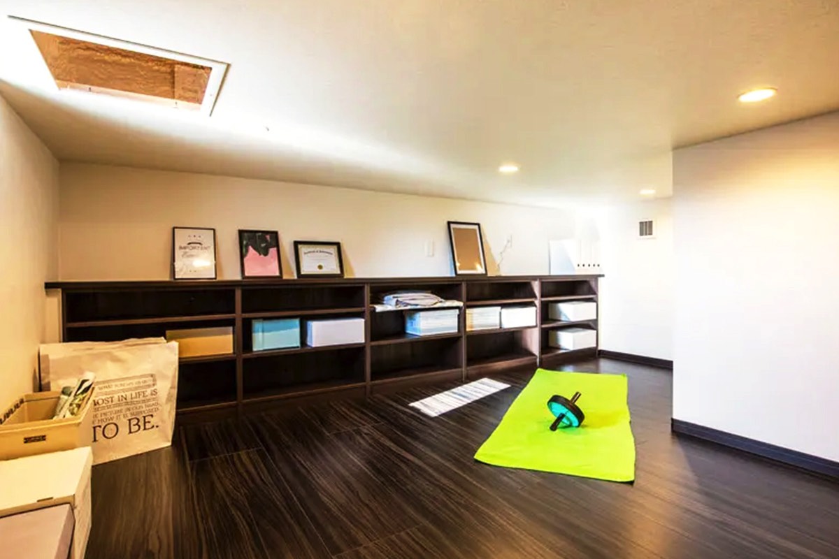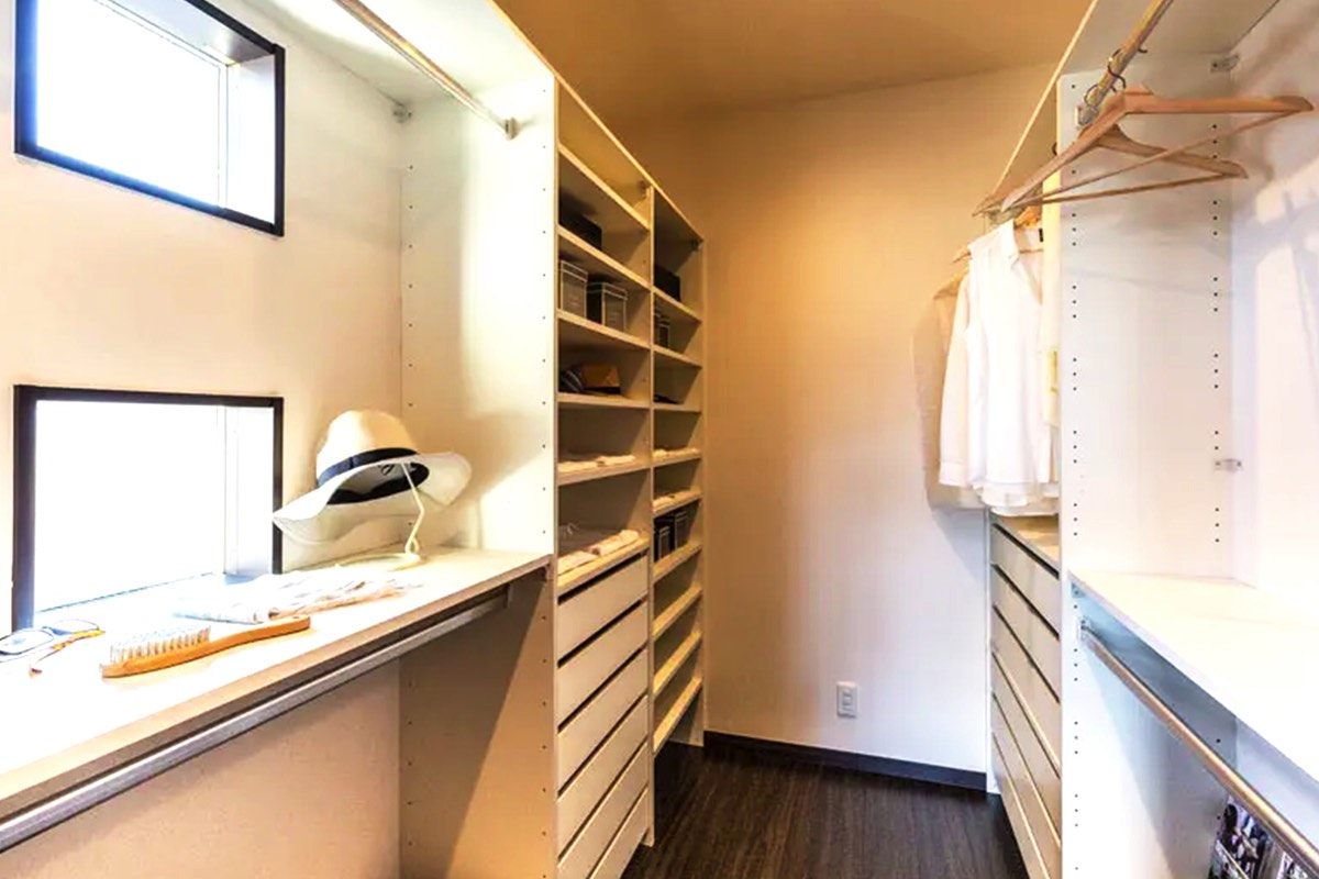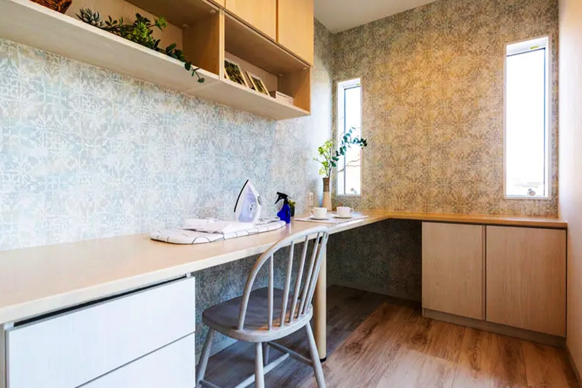 作業のしやすい大きなカウンターのある家事室は、バルコニーとも繋がり家事効率アップ。その他、寝室のウォークインクローゼットや小屋裏収納、玄関の土間収納など日常の家事が楽になる充実した収納を備える。