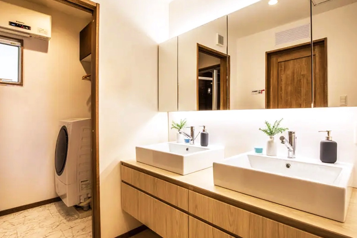 近隣の屋根の高さにある「青空リビング」は、近所の視線を気にせずBBQをしたり、本を読んだり、自由に活用できる設計。オリジナル洗面のフーガDUOは、ホテルのような独立した2ボウルで、忙しい朝も2人同時に身支度が可能に。