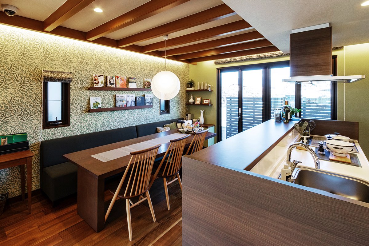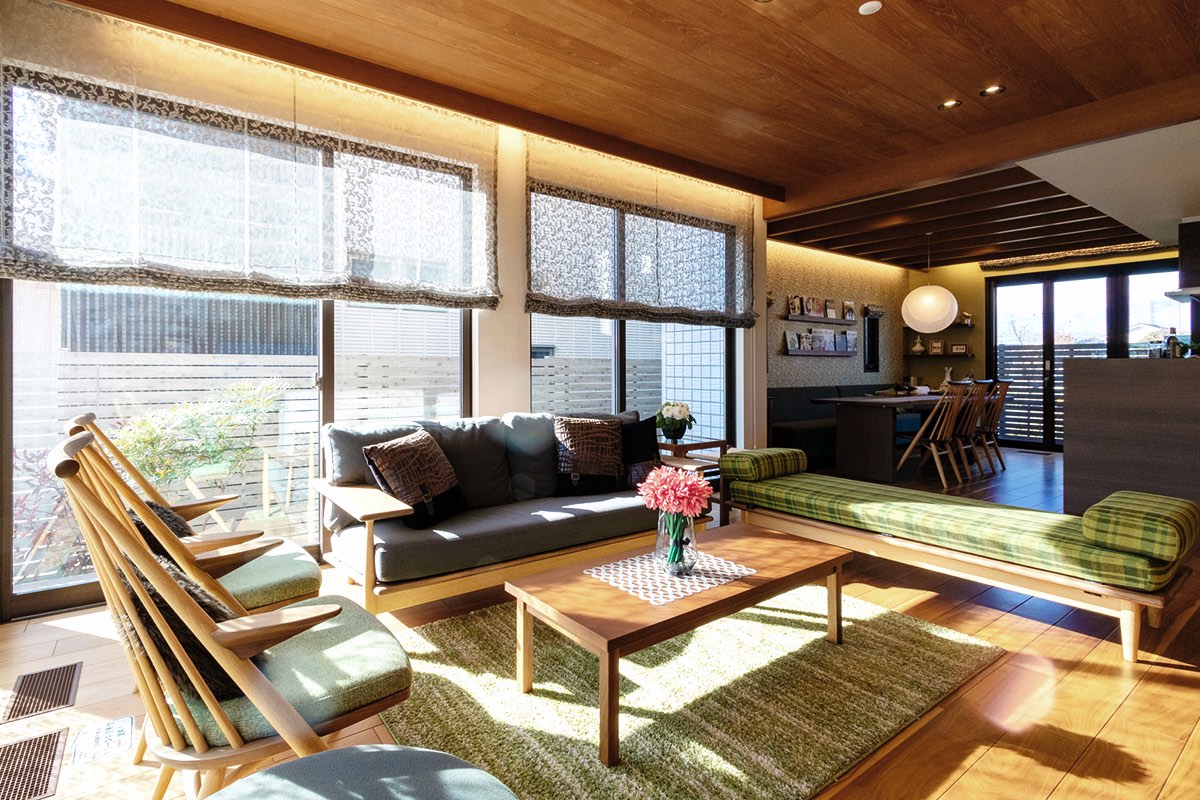 大きな窓から差し込む光と木の風合いを活かしたテイストが織りなす、開放感がありつつ落ち着きのあるLDK。構造の強さから生まれる大開口が外の景色や太陽の光をたっぷり取り込み、四季を通じて自然を身近に感じさせてくれる。