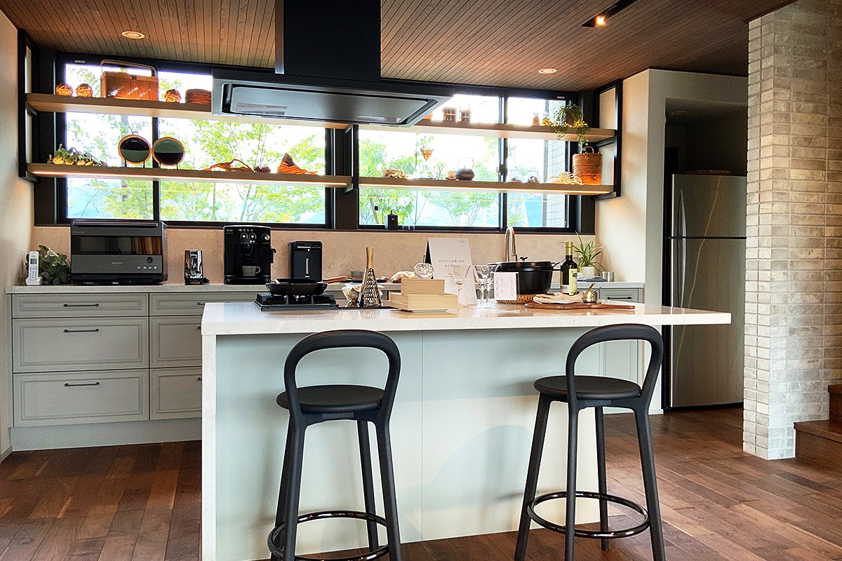 ダイニング・キッチンをメインに、多様な生活を綴る共働き家族を想定したモデルハウス。同じ空間で家族それぞれの趣味や時間を楽しみつつ、家族と視線が合うLDKのつながりが感じられる設計を採用。