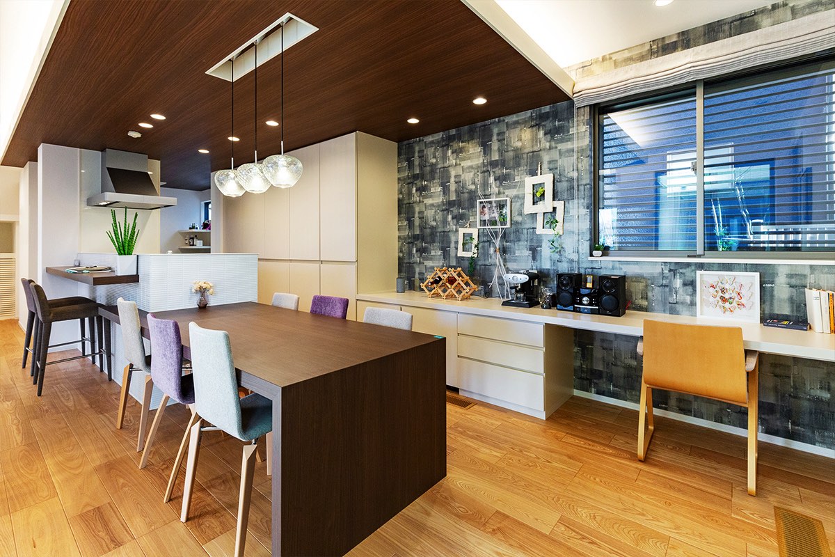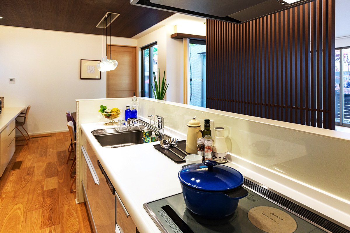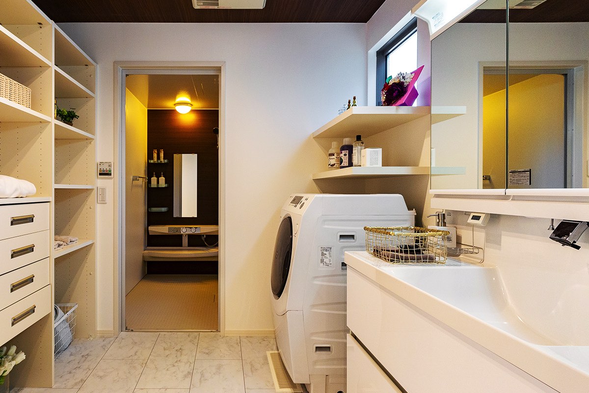 キッチンを中心に考え、ダイニングテーブル、反対側にはランドリールーム・お風呂…とつながる、家事優先の住まい。