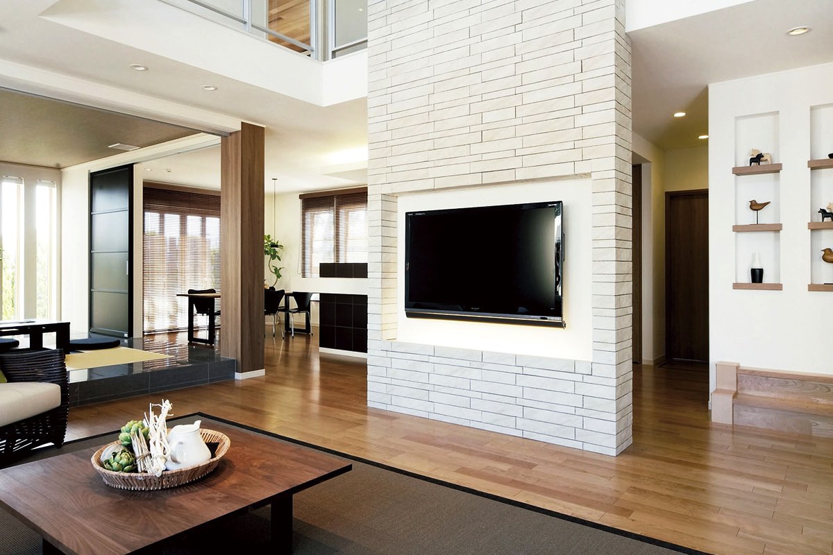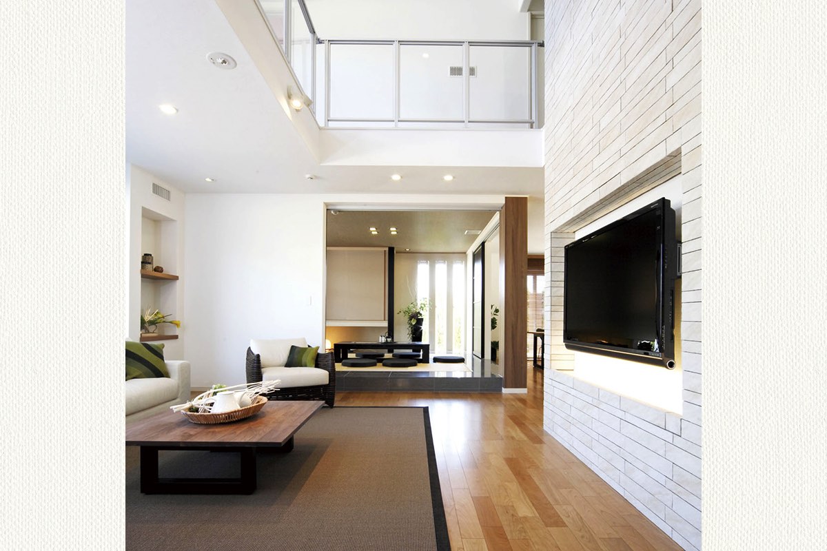 大きな吹き抜けがあり開放感溢れるリビング。吹き抜け上部までつながるアクセントウォールへタイルを施工することで、上質な高級感を感じられる空間を演出。2階とのつながりを感じられることも特徴のひとつ。