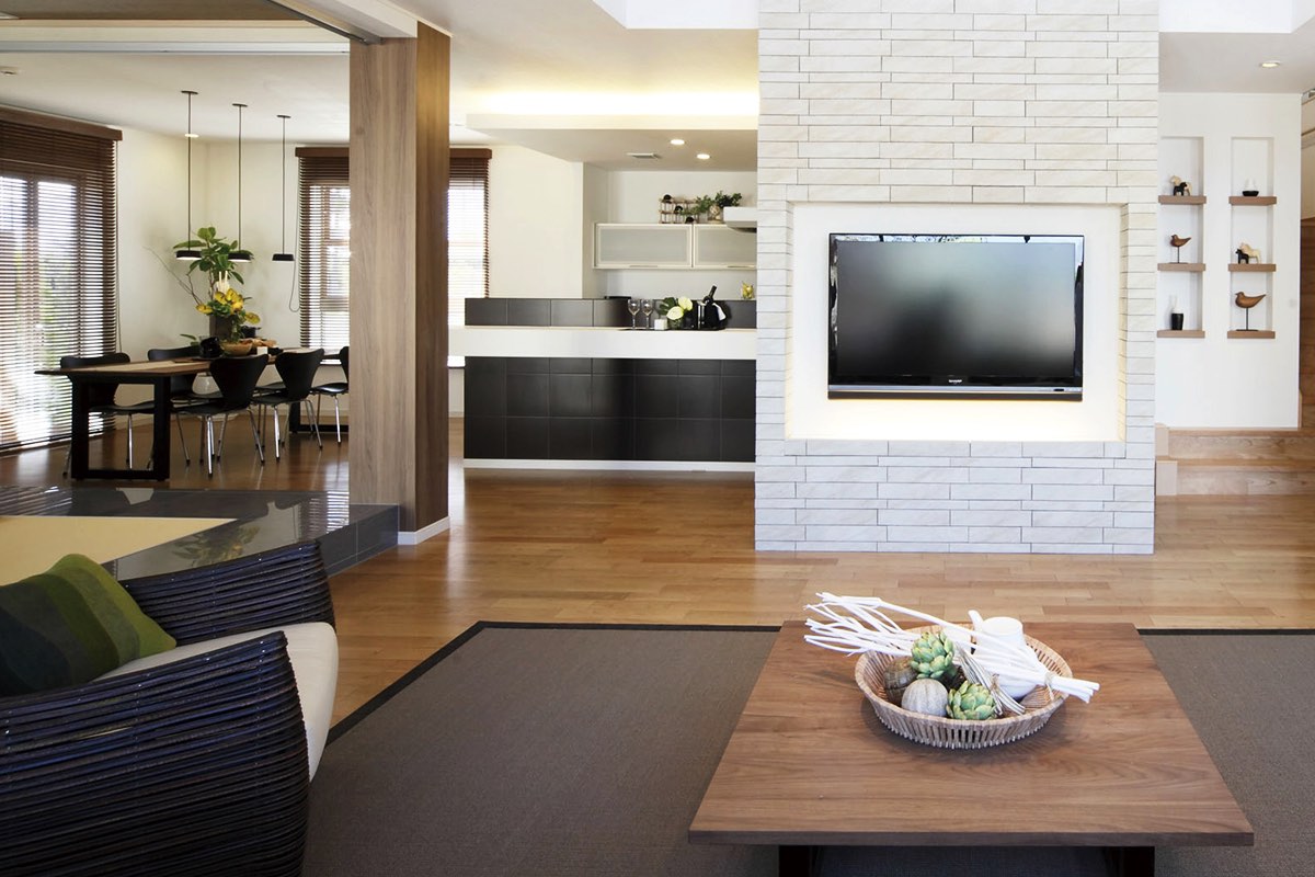 「木の素材感を活かしたナチュラルなモダンスタイル」をテーマに、インテリアコーディネートを演出。間取りの中心となるリビングには吹き抜けを設け、2階天井まで続くアクセントウォールを採用した印象的な空間を実現。