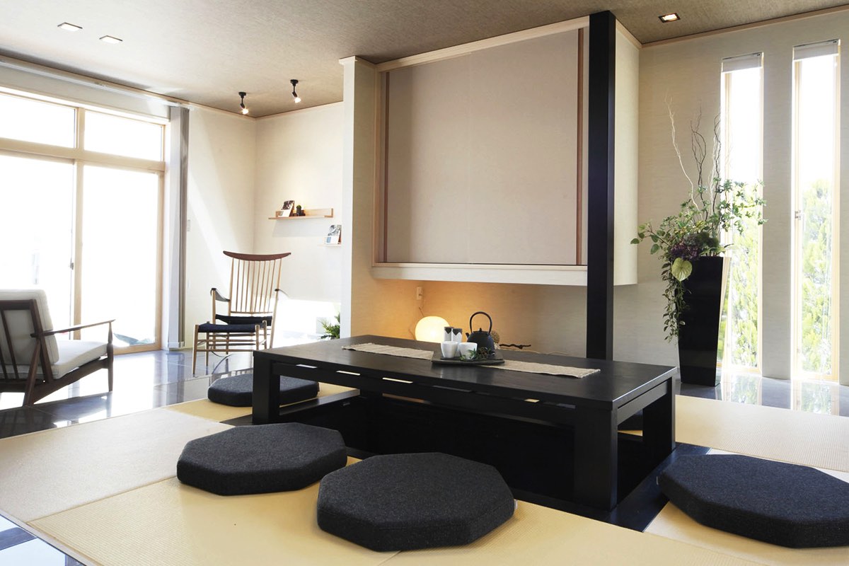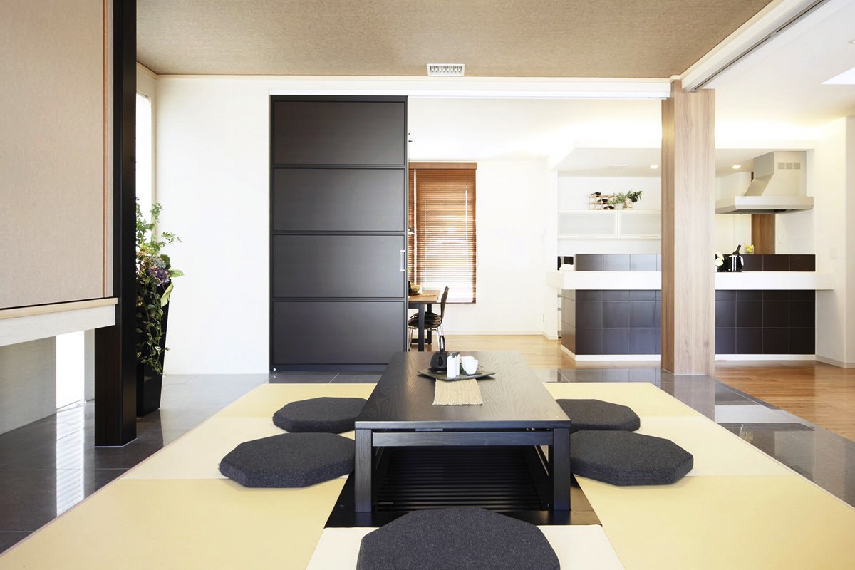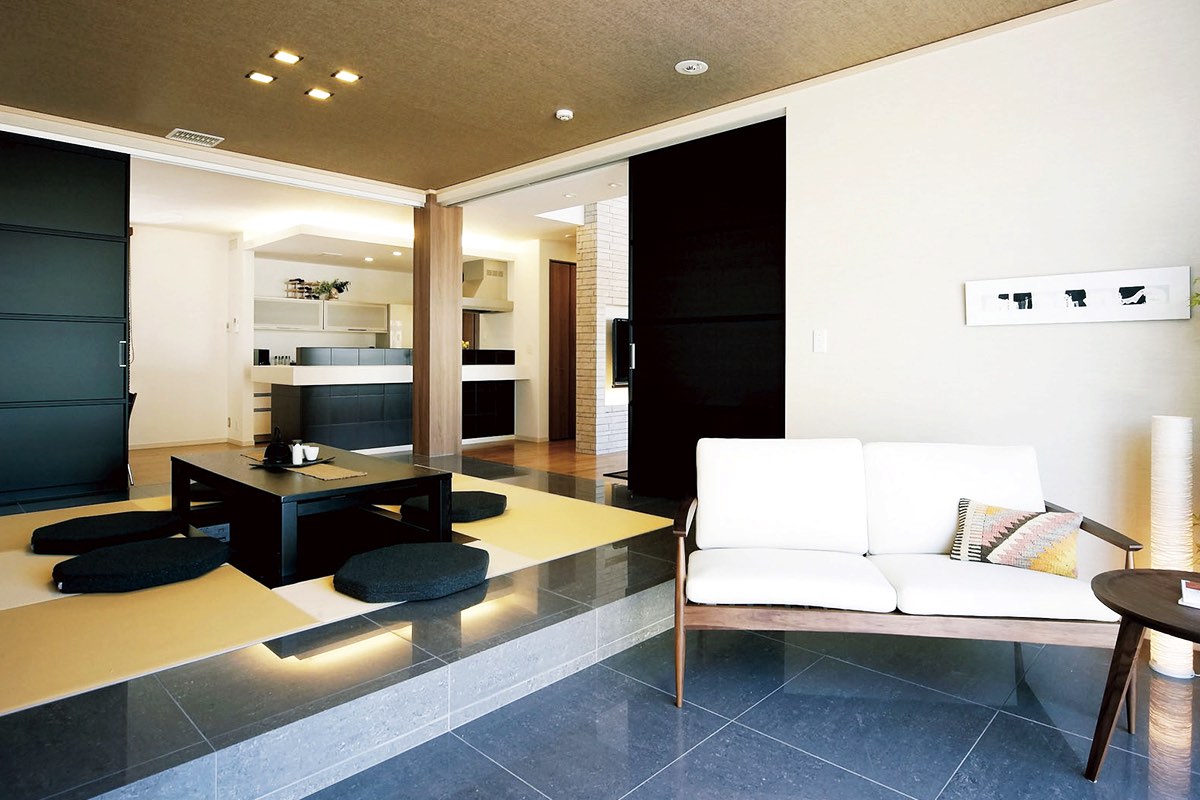 リビングと隣接する小上がりの和室。畳の周囲にタイルを施工することでタイルの無機質な質感と畳の温かみの両方が感じられるモダンな空間を演出。来客時にはおもてなしの空間としても活用できるため人気のあるお部屋。