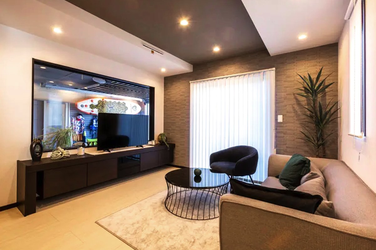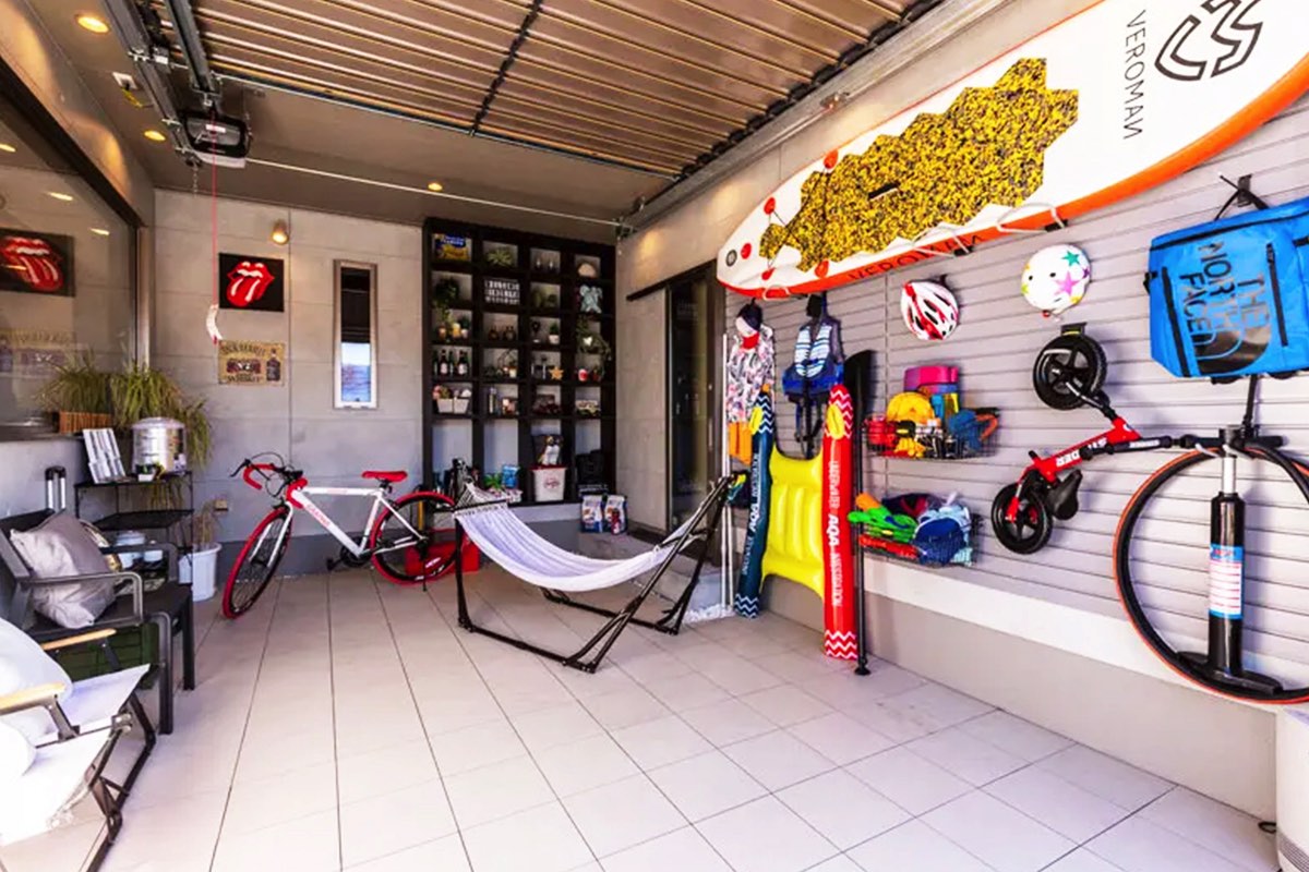 趣味のサーフボードや自転車を飾るギャラリーや、週末には友人とのパーティーの会場としても楽しめるように、ガレージ内に“家で遊べる”広い空間を設置。リビングからガラス越しに愛車を眺める贅沢な時間を演出。