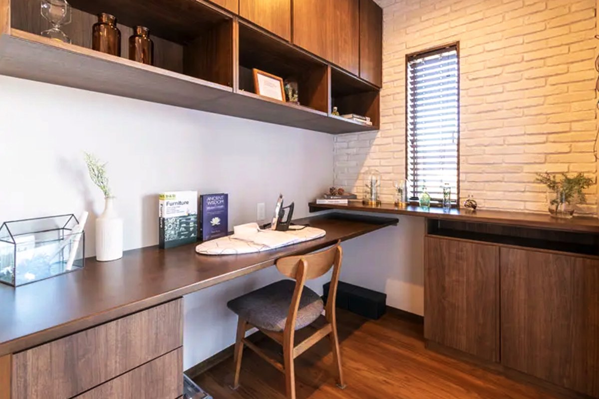 作業しやすい大きなカウンターのある家事室は、青空リビングとも繋がり家事効率アップ。そのほか、大容量の小屋裏収納や寝室脇のワークスペースなど、日常の家事や仕事が楽になる充実した設備を完備。
