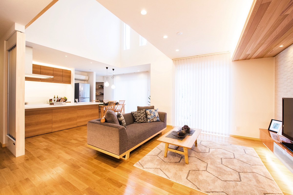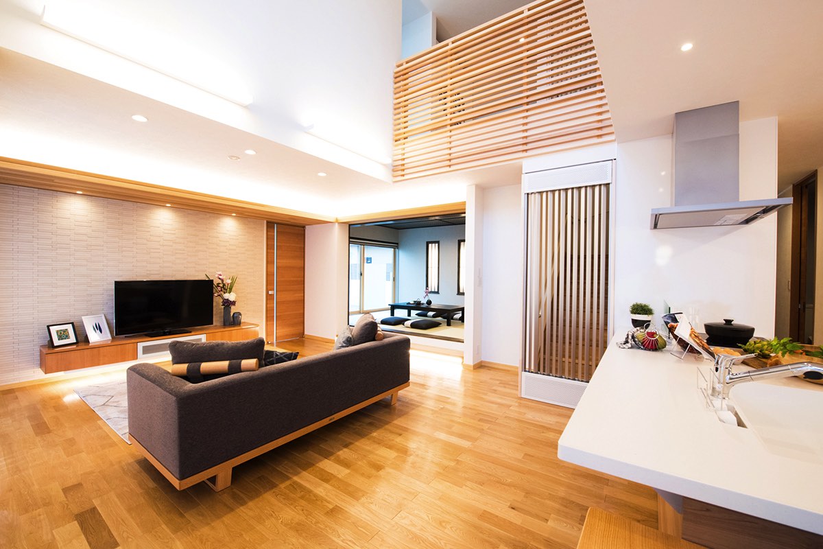 大きな吹き抜けとリビング階段、一体型の小上がりの和室が隣接したリビングは、UA値0.26の高断熱の性能だからこそ叶えられる大空間。