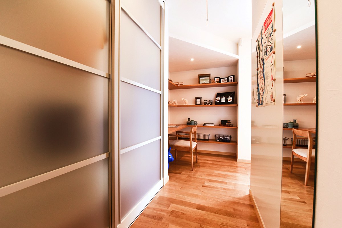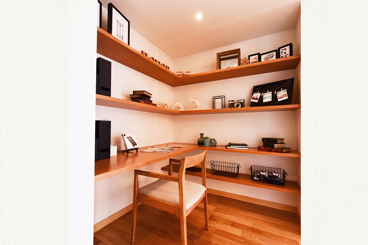 ふいの来客も困らない、いつも美しいリビングをキープするためのアイテム。リビングの一角を利用したカウンターデスクと収納スペースは、家事・育児・仕事に大忙しのママを応援するための絶好の間取り。