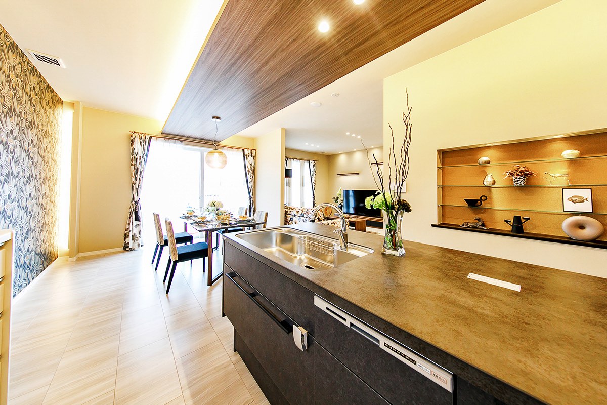 「最新技術と自然の恵み」が融合した新世代の省エネ・創エネ住宅。リビングは、仕切りを作らない開放的な設計を採用し、居心地の良い空間とスムーズな回遊動線を実現。耐震性と自由設計を兼ね備えたハイブリット住宅で、わがままなマイホームづくりを叶える。2階では、構造模型を使った構造見学も。