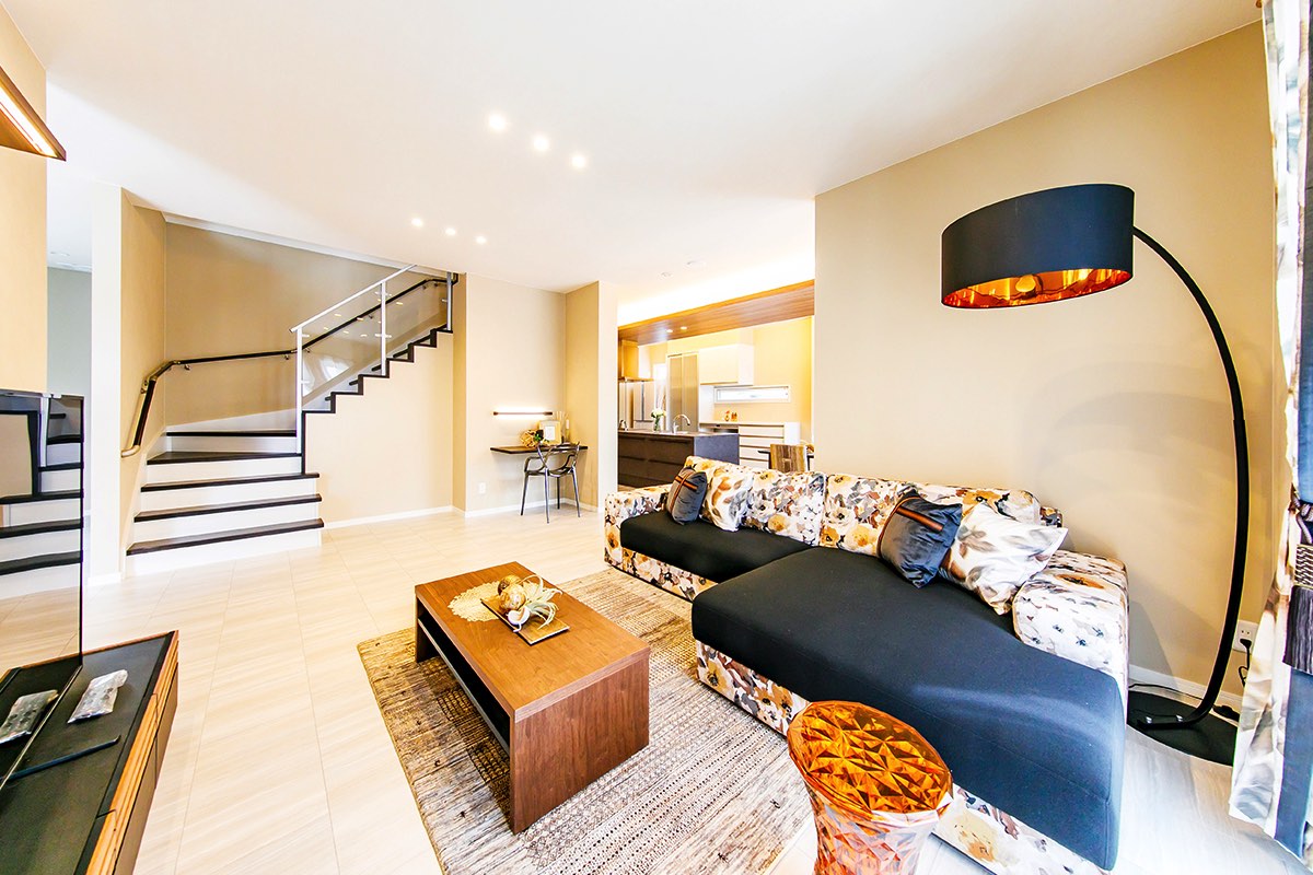仕切りを作らない開放的な設計を採用したモデルハウス。光と風が通り抜ける居心地の良い空間になっている。らせん状の階段を間取りの中心に配置した、スムーズな回遊動線も魅力。