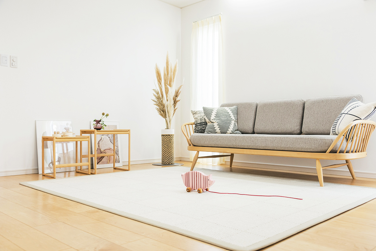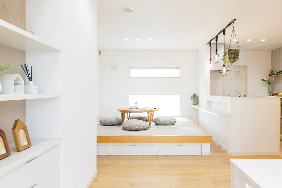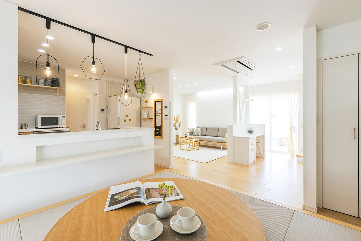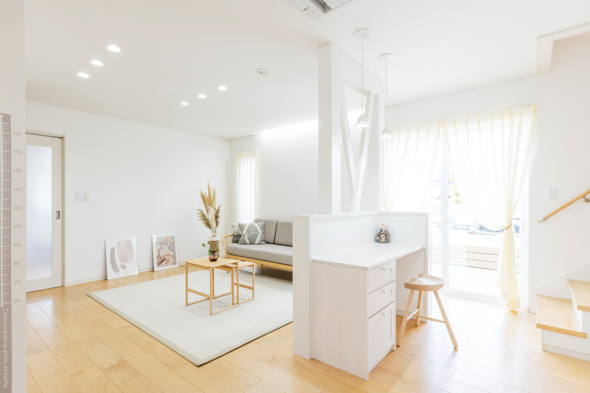 家族みんなが毎日を楽しく、幸せに暮らせる空間。中でも子供も大人も遊べるKAKUREGA®は必見!グレージュのインテリアと女性目線ならではの家づくりをご提案するモデルハウス。