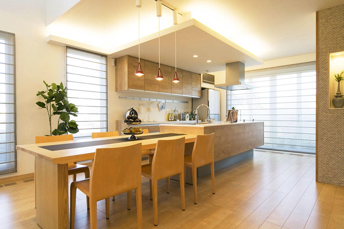 大きな窓から差し込む光と木の風合いを活かしたテイストが織りなす、開放感がありつつ落ち着きのあるLDK。構造の強さから生まれる大開口が外の景色や太陽の光をたっぷり取り込み、四季を通じて自然を身近に感じさせてくれる。