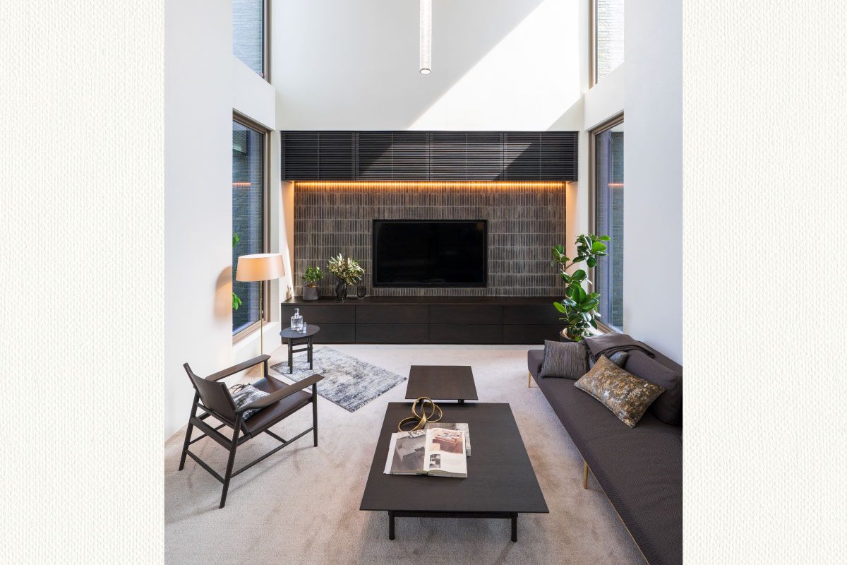 漆喰壁と自然光が織りなす心地よい開放感が魅力の吹抜空間は、空間に力強さと優しさを与え、家族の時間を包み込むような安心感を演出。壁面アートが1階と2階をつなぎ、視覚的な連続性と広がりを生み出している。