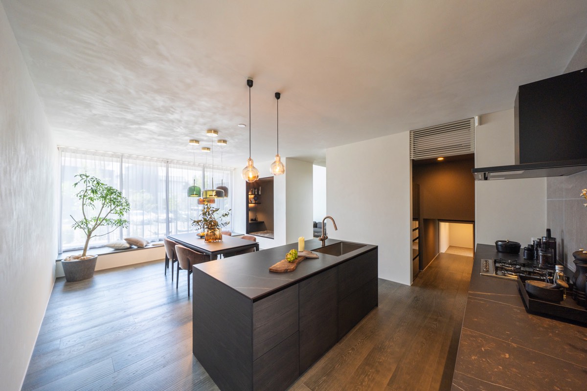 イタリアブランドの(ValcucineJP)を採用したキッチンは、機能性と美しさを備え、料理の時間を特別なひとときへと変える。タイル壁と照明が空間に深みを与え、窓辺の居場所は外部とつながる親子の愛着の場となる。