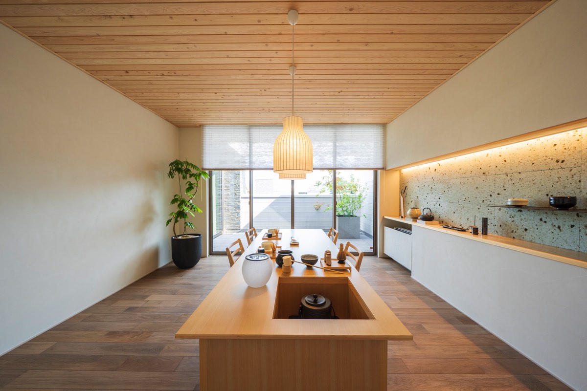 茶の湯コーナーは、奥様が茶道を楽しむ場であり、ご主人が客をもてなす場。時を重ねる毎に味わいを深める無垢のひき板と大谷石が自然の温もりと素材の力強さを感じさせ、住まう人の感性を満たす。