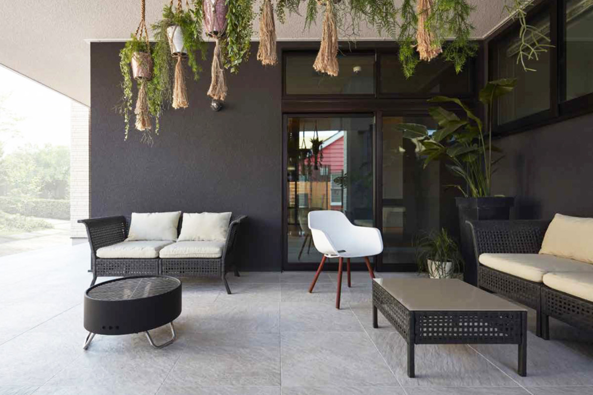 吹付にタイルをあしらったデザイン性が高い外観は、バルコニー高壁がアクセントに。季節に合わせて日差しを調節する深い軒は、夏の日差しを遮り、冬の日差しを取り込むことで、機器のみに頼らない「涼温房」の生活がコンセプト。