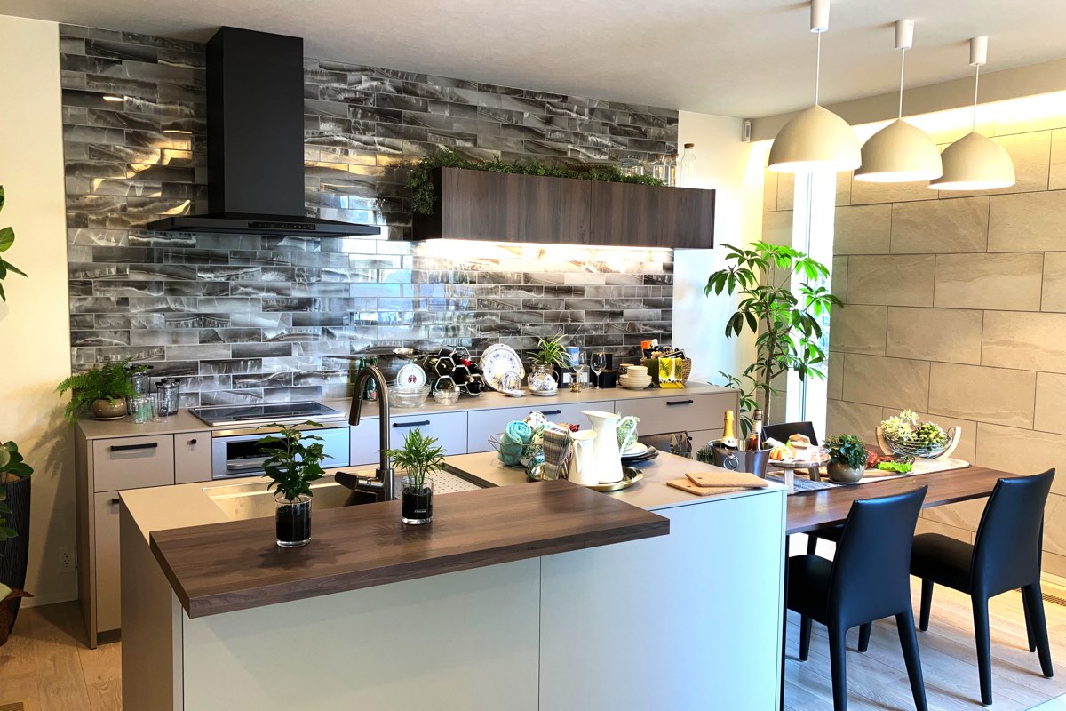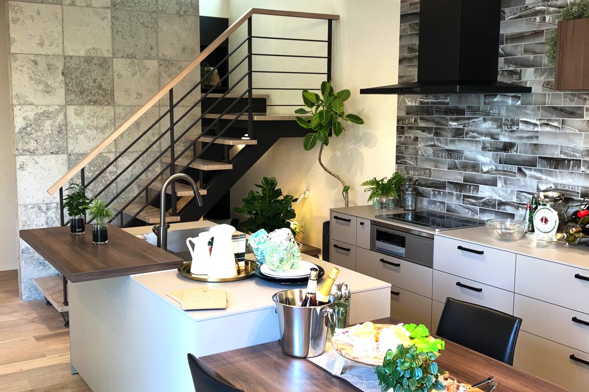 “作る”“運ぶ”“片づける”がシンプルな横動線だけで出来るキッチンの横に、ダイニングを配置した『ストレートダイニング』。キッチンと同じカラーのダイニングテーブルをコーディネイトすることで、統一感のある空間に。