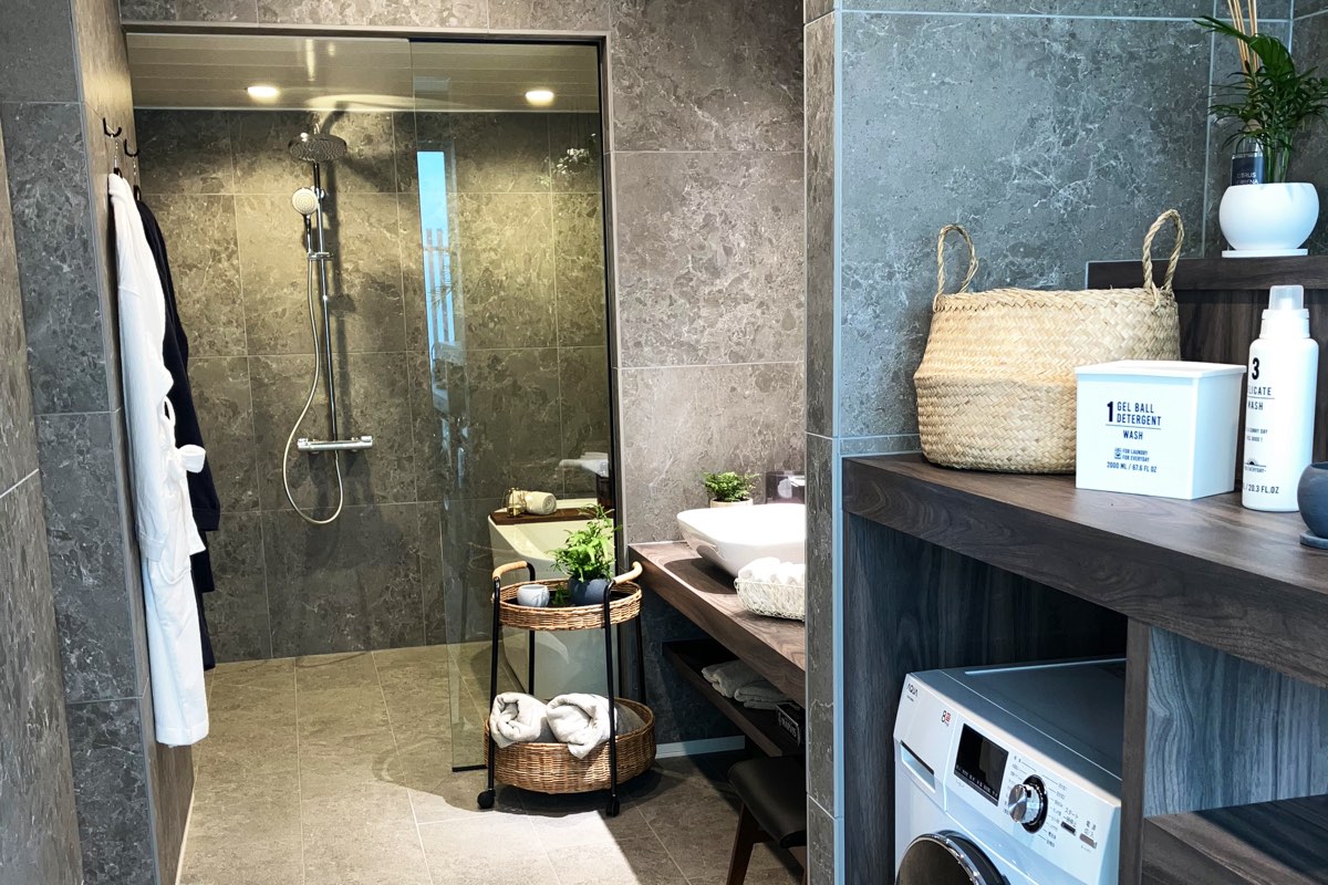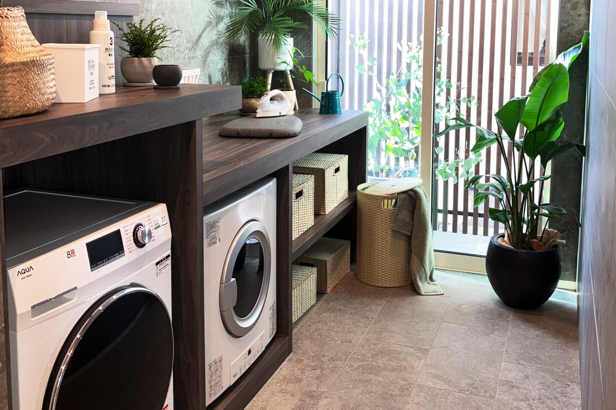 インテリアのデザインの統一化と共に、水廻りを直線上に繋げることで、使い勝手の良い家事動線を実現。