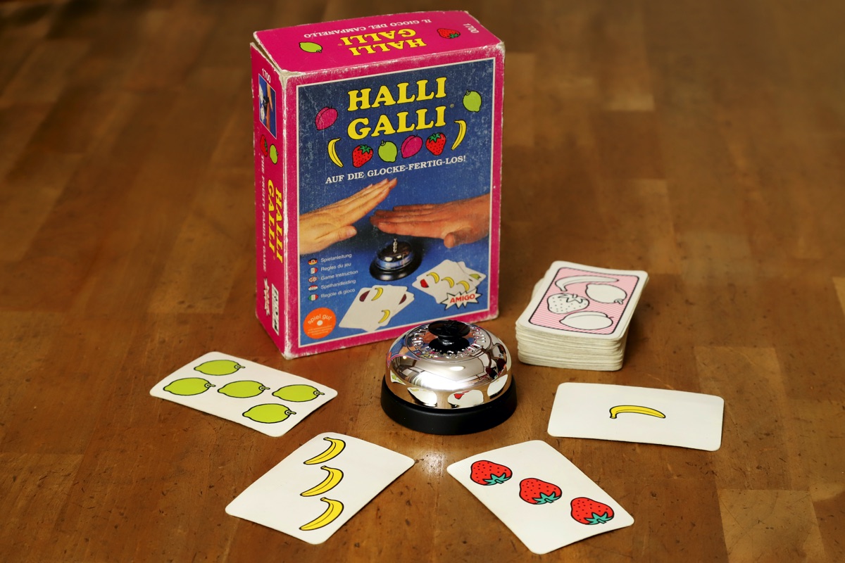カードにはフルーツのイラスト。同じフルーツの合計が5個になったら、いち早くベルを鳴らした人の勝ち。「チーン」と鳴るベルがドキドキワクワク感をかきたてて、子どもも大人も大興奮!