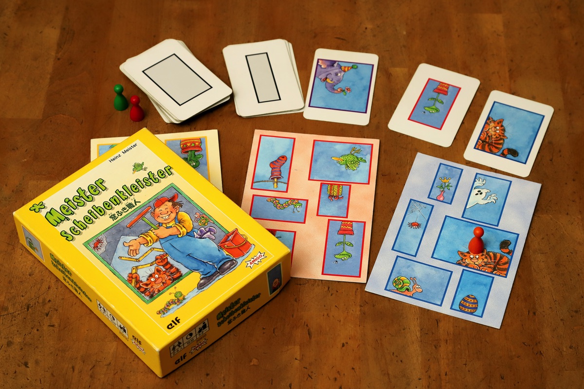 出題カードに書かれた四角形と同じ四角形をイラストカードから探す単純なゲーム。でも、キャラクターが書かれていたり向きが違うだけで、これがなかなか難しい!集中力と空間把握能力と記憶力が試されるゲーム。