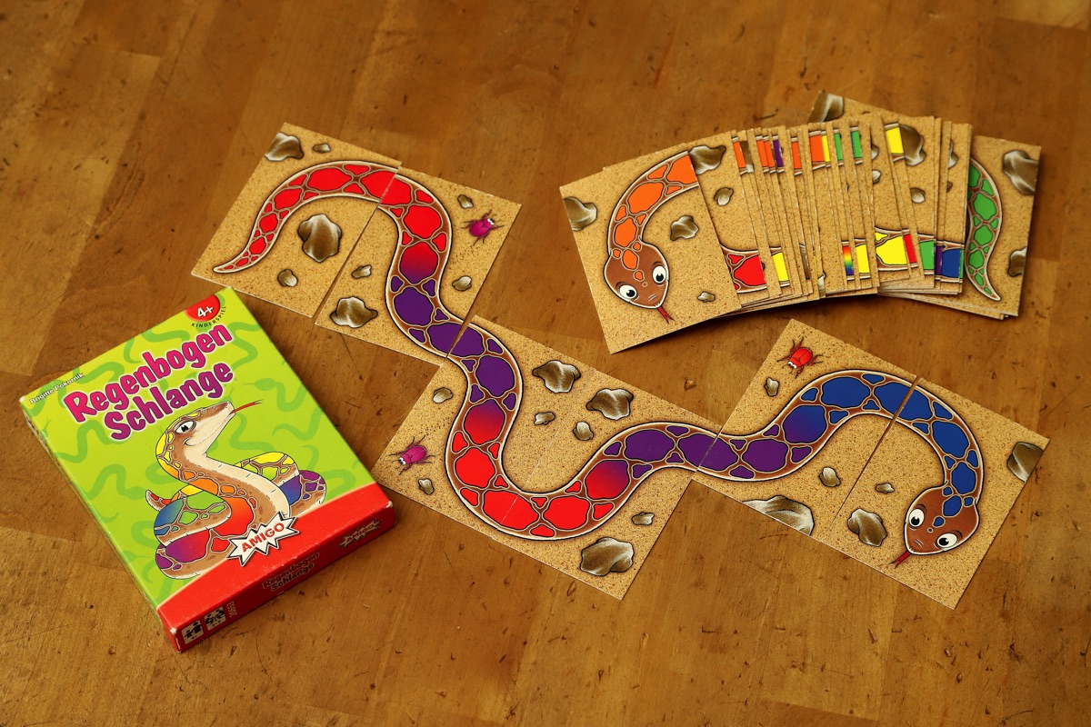 カードの種類はヘビの頭・胴体・しっぽの3種類で、どれもカラフル。同じ色同士でつなげて完全な1匹のヘビになったらカードをゲット。1番多くカードを持っている人の勝利!ちなみに虹色のヘビはどの色のヘビにもつなげられるので、出たらラッキー♪