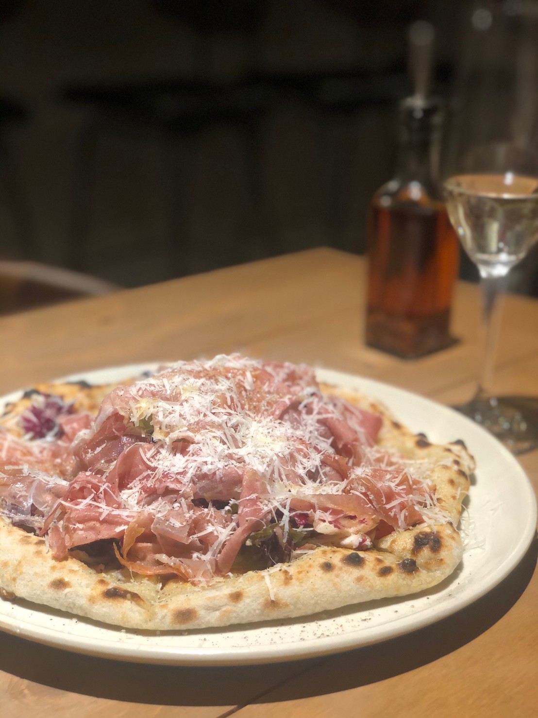 おしゃれなレストラン。女子会にぴったりな空間でした。もっちもちのピザ生地にたっぷりサラダと生ハムが乗...