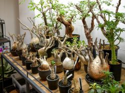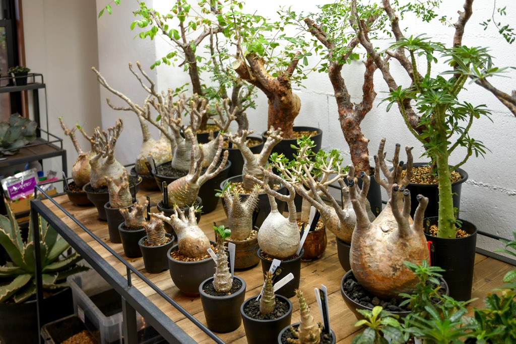 多肉植物の中でも、特にマニアを虜にするユニークな姿がブレイク中の塊根植物がズラリ。流通数が少なく、かなりレアな植物で、これだけの品揃えを誇るのは山梨でも稀。