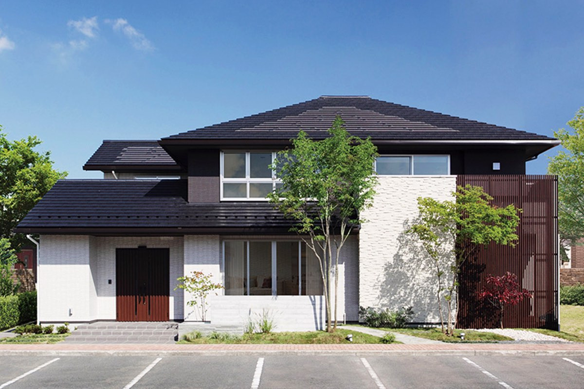 高性能な2×6工法をベースに、味わい深いタイルを纏った健康で快適、強く安心な住まいへ。 安定感のある重厚なシルエットに、白い外壁タイルと木調の縦格子が、洗練された和モダンテイストを創出する外観デザイ... -