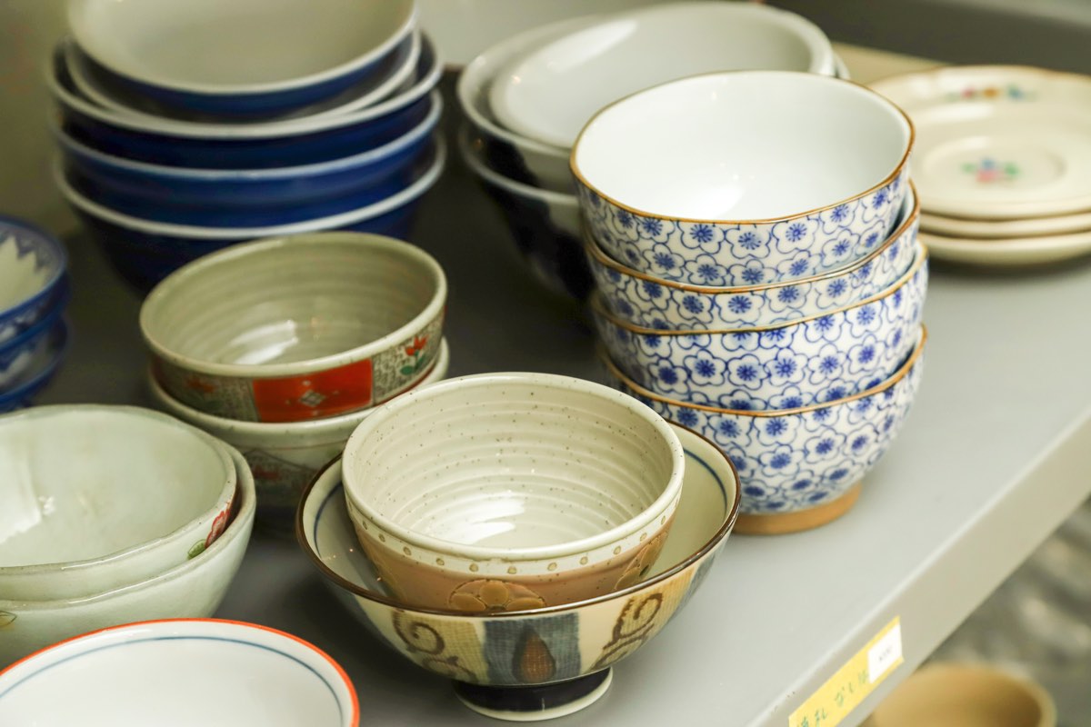 お皿やグラスのほか、カメラや椅子など、食器から家具まで幅広い商品がラインナップする。中には、糸やハサミなど小物が入ったままの裁縫箱の販売も。