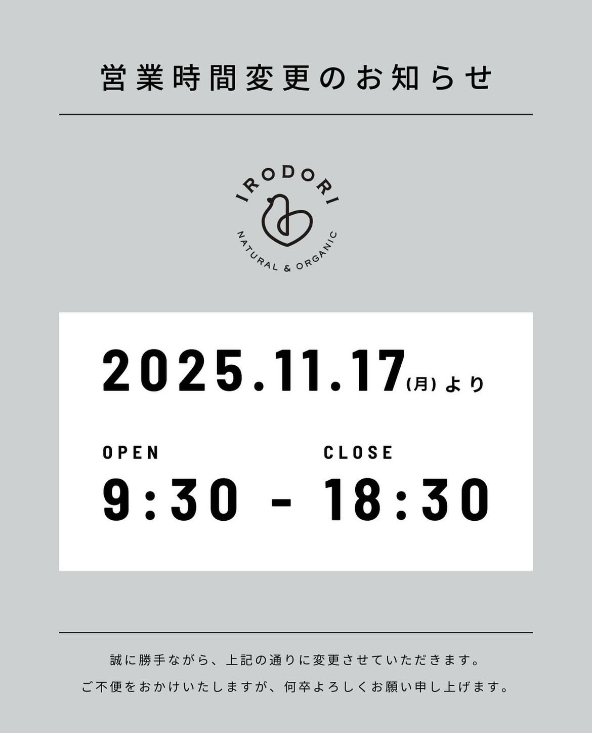 11月17日(月)より、営業時間を変更し、